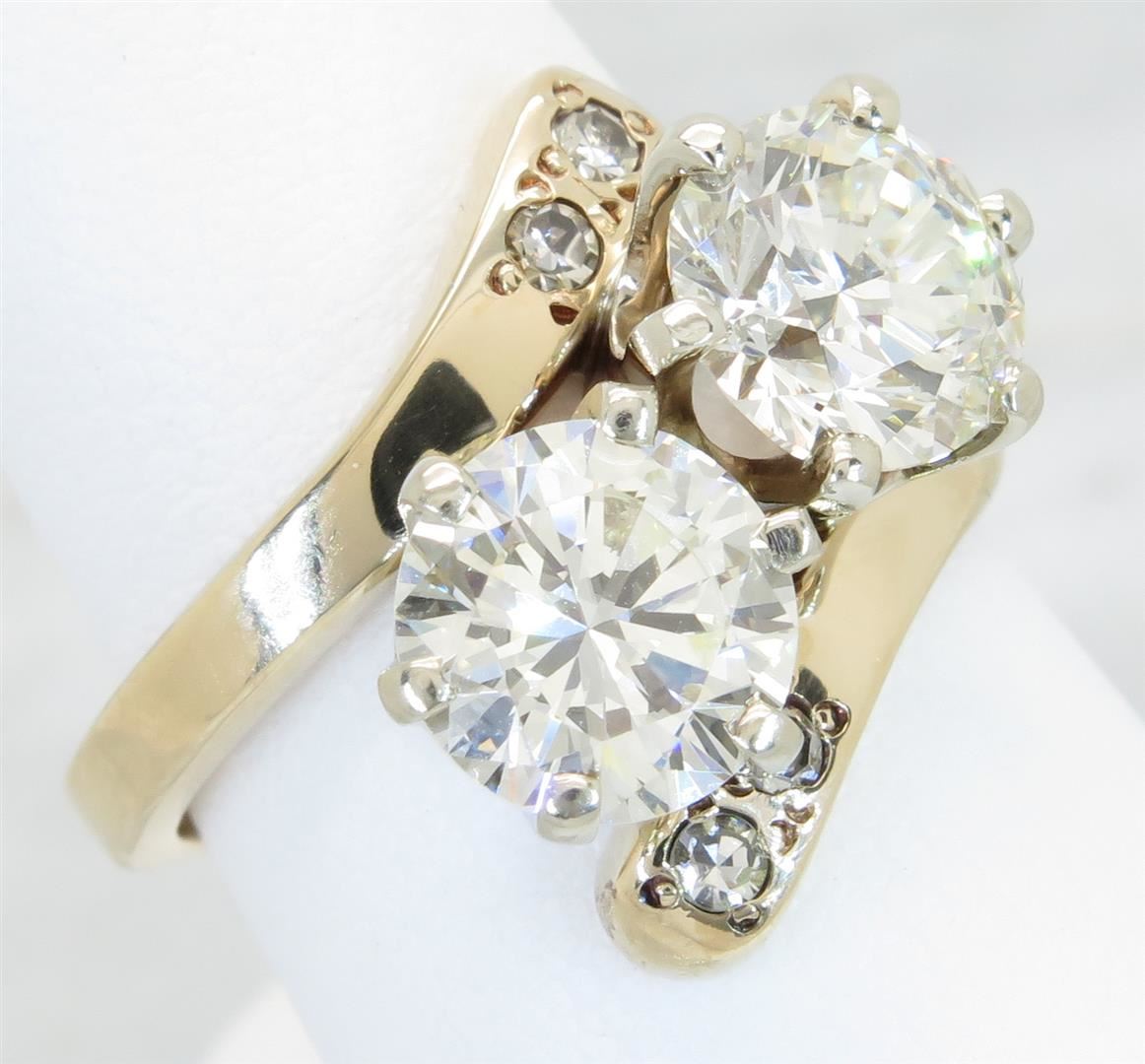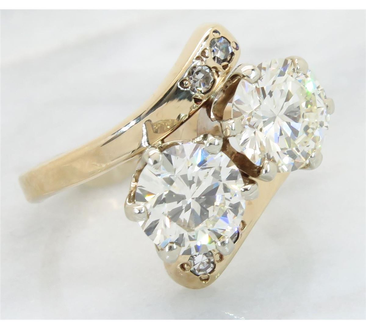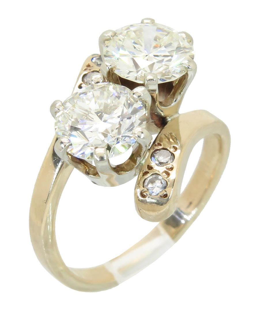 One tested 14K yellow gold diamond ring. Containing: Two Round Transitional Cut Diamonds. Approximate size: 1.48CT and 1.42CT, Clarity: VS1-VS2, Color: L-N. Four Single Cut Diamonds. Approximate total diamond weight: 3.00CTW. All diamonds are graded in the mounting unless otherwise stated. Weight of ring: 5.9 grams, Size: 5.5.