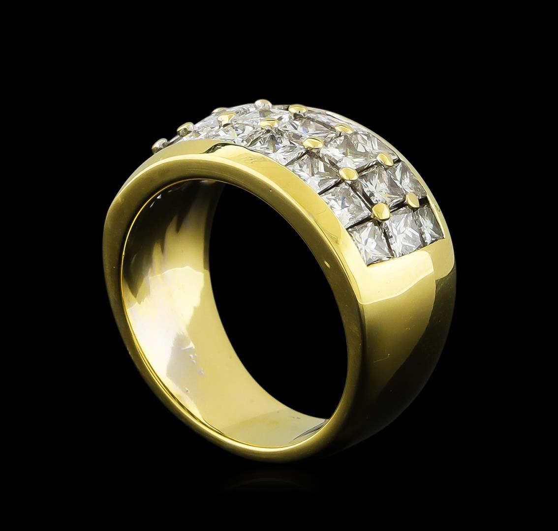 One electronically tested 14KT yellow gold lady's cast wide dome style ring with a bright polish finish. The featured lady's ring has a shank measuring 6.10 millimeters wide. Identified with markings of "14K". Condition is new, good workmanship. Containing: Twenty-Four prong set princess cut diamonds, measuring 3.00 x 2.50 x 1.95mm (depth est.) approximate total weight of 24 Stones = 3.00ct. Graded in the setting. Clarity: VS-2 to SI-2. Color: G - Good. Total Weight of Diamonds 3.00ct. Total Weight of Ring 8.80gm GAS Appraised at $8,990.00.