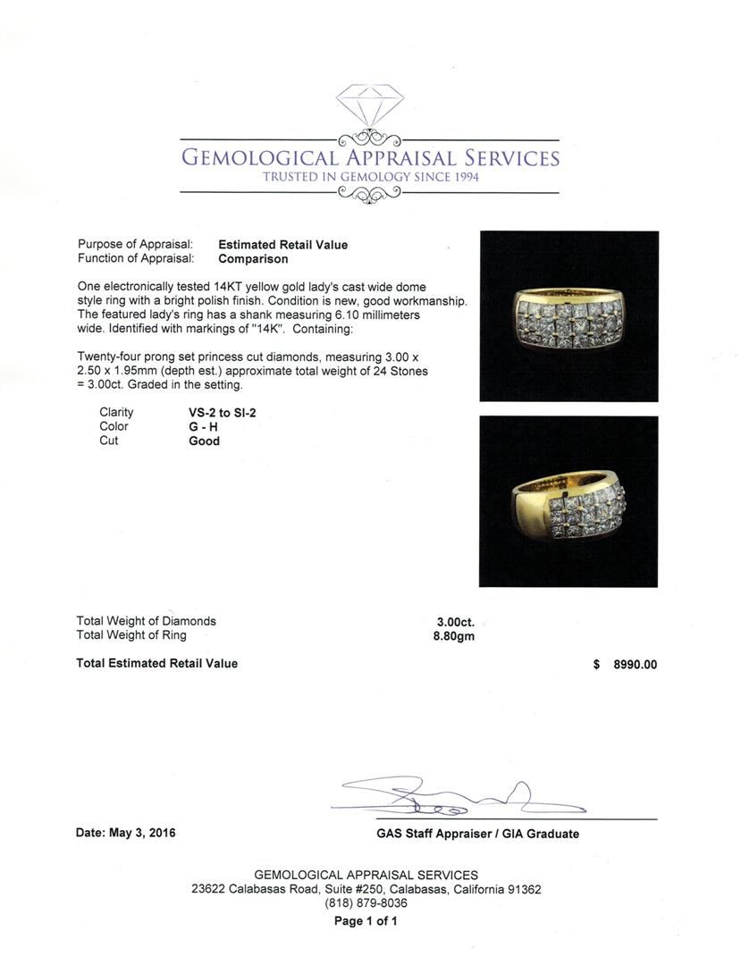 One electronically tested 14KT yellow gold lady's cast wide dome style ring with a bright polish finish. The featured lady's ring has a shank measuring 6.10 millimeters wide. Identified with markings of "14K". Condition is new, good workmanship. Containing: Twenty-Four prong set princess cut diamonds, measuring 3.00 x 2.50 x 1.95mm (depth est.) approximate total weight of 24 Stones = 3.00ct. Graded in the setting. Clarity: VS-2 to SI-2. Color: G - Good. Total Weight of Diamonds 3.00ct. Total Weight of Ring 8.80gm GAS Appraised at $8,990.00.