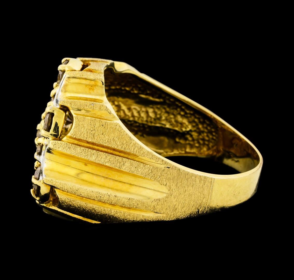 One electronically tested 14KT yellow and white gold man's combination cast & assembled fashion ring with a tapered shank with a bright polish and satin finish. The featured man's ring has a shank measuring 4.11 millimeters wide. Identified with markings of '14K'. Condition is new, good workmanship. Containing: Thirteen prong set round brilliant cut diamonds, measuring 4.10 - 3.70 x 2.42mm (depth est.) approximate total weight of 13 Stones = 3.00ct. Graded in the setting. Clarity SI-1 to SI-2 Cut Good. Total Weight of Diamonds 3.00ct.. Total Weight of Ring 10.30gm. GAS Appraised at $4,920.00.