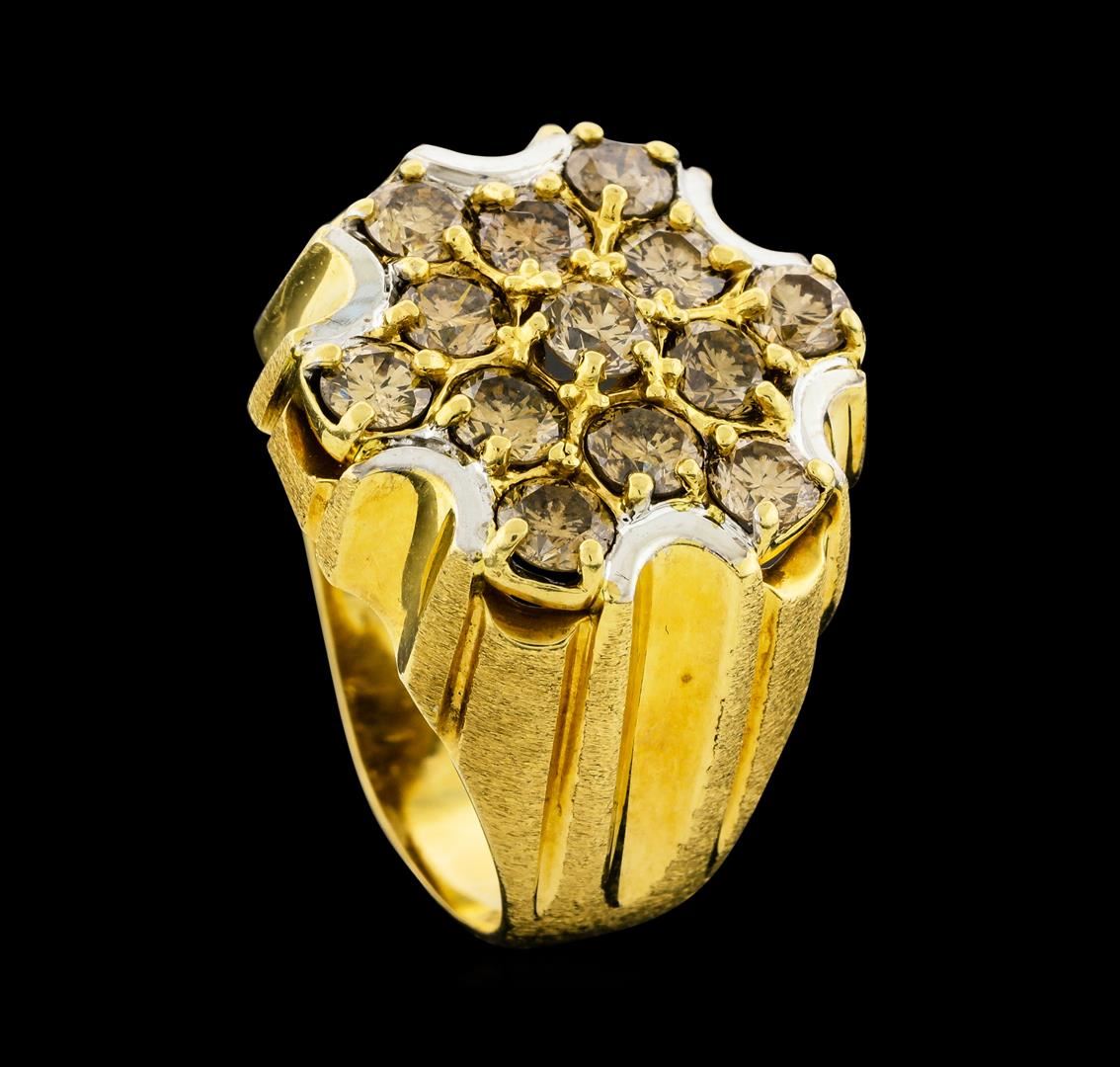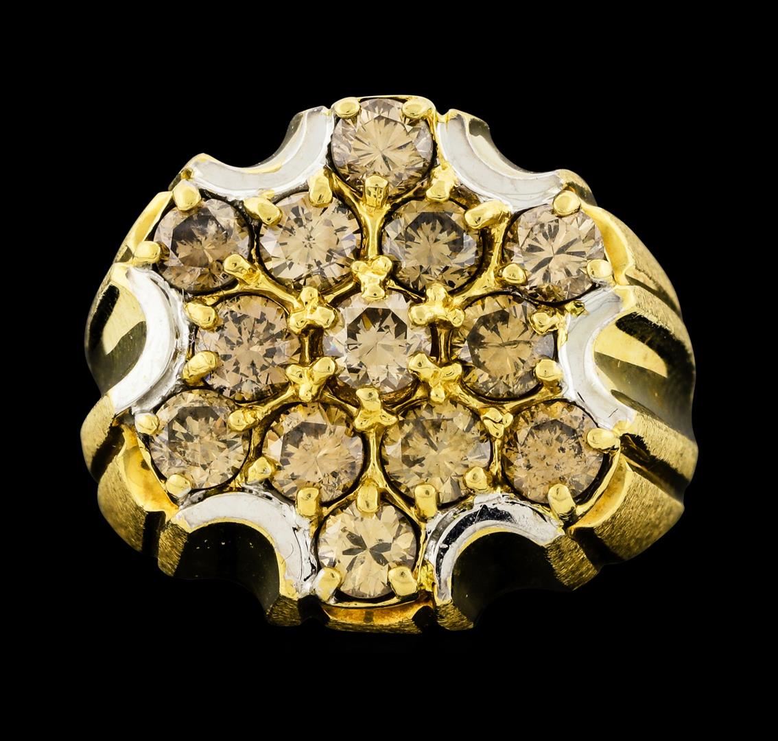 One electronically tested 14KT yellow and white gold man's combination cast & assembled fashion ring with a tapered shank with a bright polish and satin finish. The featured man's ring has a shank measuring 4.11 millimeters wide. Identified with markings of '14K'. Condition is new, good workmanship. Containing: Thirteen prong set round brilliant cut diamonds, measuring 4.10 - 3.70 x 2.42mm (depth est.) approximate total weight of 13 Stones = 3.00ct. Graded in the setting. Clarity SI-1 to SI-2 Cut Good. Total Weight of Diamonds 3.00ct.. Total Weight of Ring 10.30gm. GAS Appraised at $4,920.00.