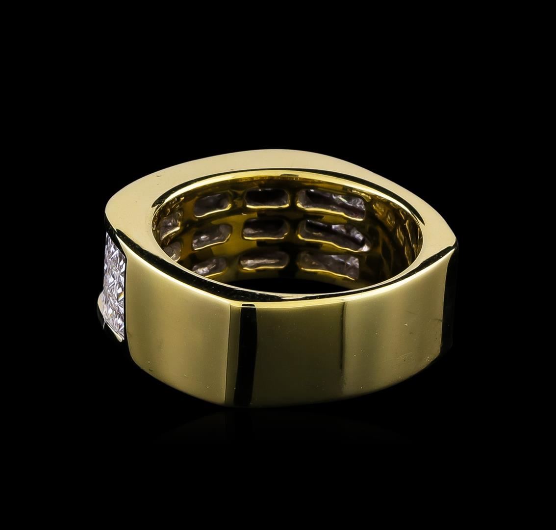 One electronically tested 18KT yellow gold cast diamond ring. The ring features an elaborate diamond set curvature, completed by a eight and one-half millimeter wide band. Bright polish finish with rhodium accents. Identified with markings of "18K". Condition is good. Containing: Forty-Five invisible set princess cut diamonds, measuring 2.30 x 2.20 x 1.65mm (depth est.) approximate total weight of 45 Stones = 3.00ct. Graded in the setting. Clarity: VS-2 to SI-1 . Color: G - H. Total Weight of Diamonds 3.00ct.. Total Weight of Ring 18.79gm. AIG Appraised at $12,790.00.