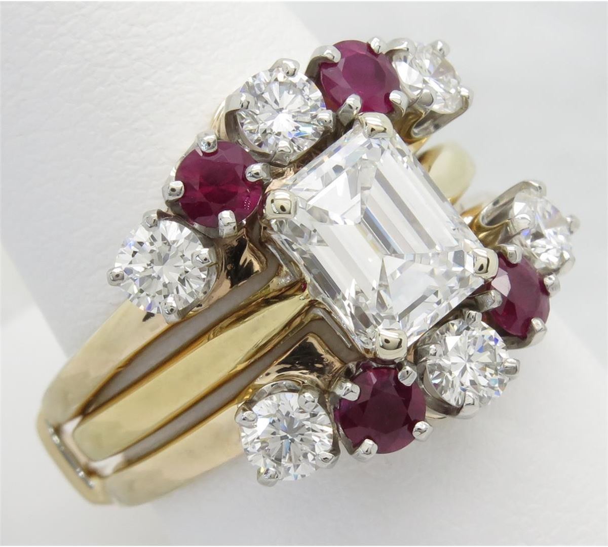 One tested 18K yellow gold diamond ring and wrap. Containing: One Emerald Cut Diamond. Approximate size: 2.00CT. Clarity: VS2, Color: F-G. The wrap consists of 6 Round Brilliant Cut Diamonds and 4 round rubies. Approximate total ruby weight: .80CTW. Approximate total diamond weight in wrap: 1.00CTW. Diamonds are graded in the mounting, unless otherwise stated. Weight: 10.0 grams, Size: 8.0.