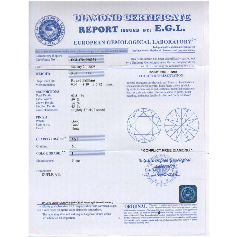 3.00 ctw EGL Certified Round Brilliant I,VS1 **|**|** CTW: 3.00 ; Shape: Round Brilliant ; Diamond Color: I ; Diamond Clarity: VS1; Measurement: 8.89-9.04x5.72 ; Certifiication: EGL ISRAEL ; Girdle: Slightly Thick ; MSRP: $62400