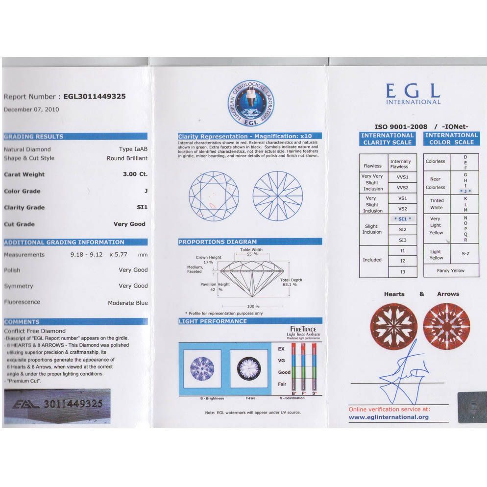 3.00 ctw EGL Certified Round Brilliant J,SI1 **|**|** CTW: 3.00 ; Shape: Round Brilliant ; Diamond Color: J ; Diamond Clarity: SI1; Measurement: 9.12-9.18x5.77; Cut: VG ; Certifiication: EGL ISRAEL ; Girdle: Medium ; MSRP: $37500