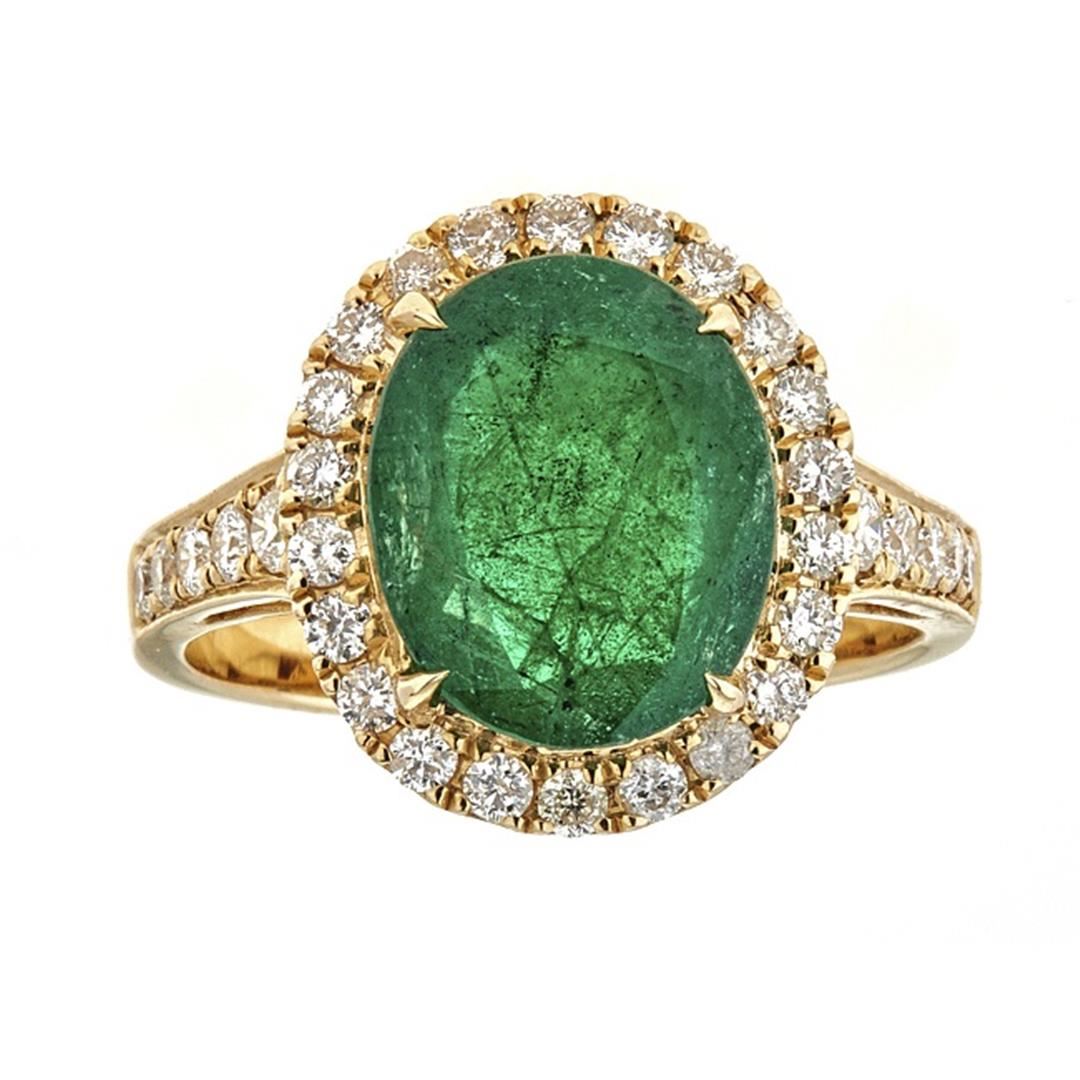 One Emerald and Diamond Ring featuring: 18KT Yellow Gold weighing a total of 5.22 grams, Emerald with a total weight of 3.00ct, and 32 Diamonds with a total weight of 0.61ctw.