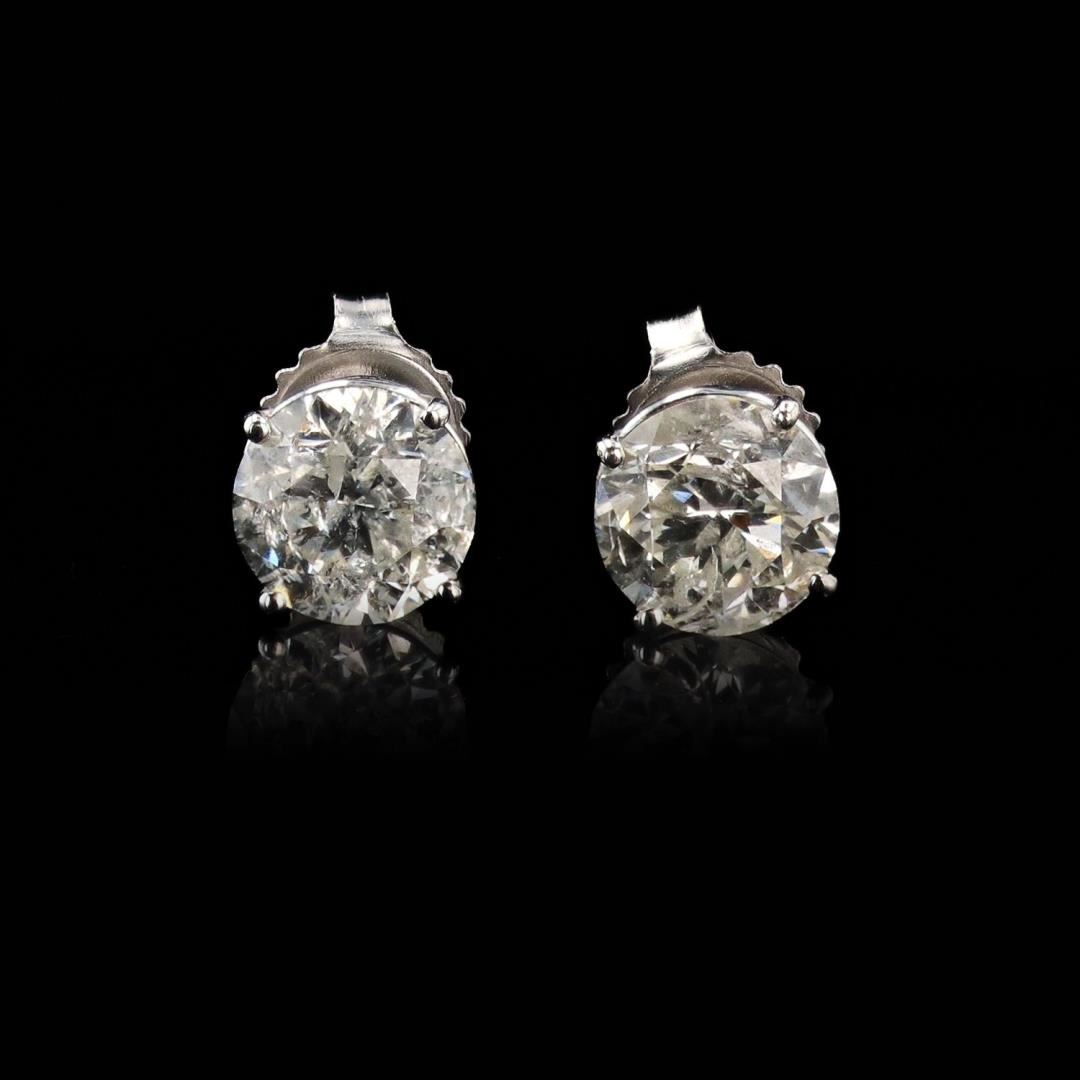 One polished. stamped. and tested pair of 18K white gold stud earrings with friction posts and backings. The earrings are mounted with 2 genuine round diamonds weighing approximately 3.00 carats. This item weighs 1.9 grams. condition is new, excellent workmanship. #MAIN GEMSTONES# Identity: Natural Diamond Shape: Round Cutting Style: Brilliant Cut Quantity: 2 Diamonds Average Diameter: 6.9mm, 7.0 mm Total Weight: 3.00 carats Color Grade: F-G Clarity Grade: I1 Polish: Very Good Symmetry: Very Good Refractive Index: 2.417 Specific Gravity: 3.52 +/-0.01 Hardness: 10 TOTAL DIAMOND WEIGHT: 3.00 ctw WEIGHT OF ITEM: 1.9 grams GOLD CONTENT: 18K White Gold