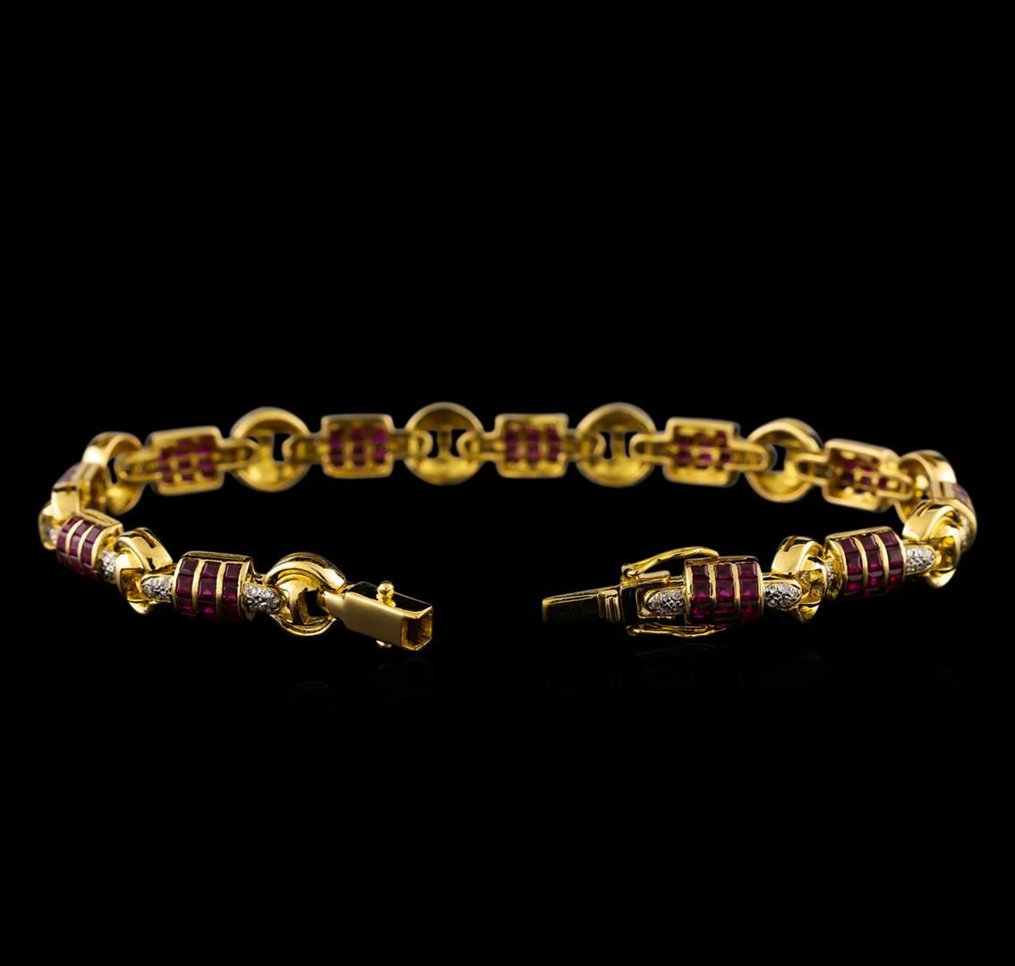 One electronically tested 18KT yellow gold ladies cast & assembled ruby and diamond bracelet. Seven and three-quarters inch length bracelet features a flexible ribbon of ruby set links with diamond accents connected by circular gold links, terminating in a box clasp with twin safeties. Bright polish finish with rhodium accents. Identified with markings of "750". Condition is good. Containing: One hundred thirty-two channel set square step cut natural rubies, measuring 1.80 x 1.50 x 1.07mm, approximate total weight of 3.00ct., clarity is eye clean, type II, medium dark, very slightly brownish, strongly purplish red color, (GIA stpR 6/3), cut is good. Transmitting light with no distortion, transparent. Measurements & the color grade are an average for the group. Graded in the setting. Fifty-Five prong set round brilliant cut diamonds, measuring 1.00 - 0.80 x 0.54mm (depth est.) approximate total weight of 55 Stones = 0.20ct. Graded in the setting. Clarity: I-1 to I-2. Color: G - I. Total Weight of Colored Stones 3.00ct. Total Weight of Diamonds 0.20ct. Total Weight of Bracelet 18.94gm. AIG Appraised at $6,830.00.