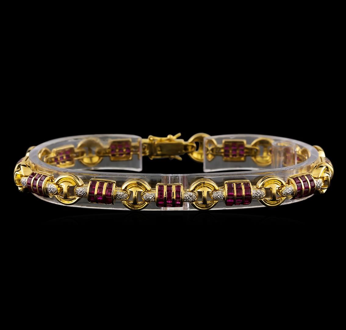 One electronically tested 18KT yellow gold ladies cast & assembled ruby and diamond bracelet. Seven and three-quarters inch length bracelet features a flexible ribbon of ruby set links with diamond accents connected by circular gold links, terminating in a box clasp with twin safeties. Bright polish finish with rhodium accents. Identified with markings of "750". Condition is good. Containing: One hundred thirty-two channel set square step cut natural rubies, measuring 1.80 x 1.50 x 1.07mm, approximate total weight of 3.00ct., clarity is eye clean, type II, medium dark, very slightly brownish, strongly purplish red color, (GIA stpR 6/3), cut is good. Transmitting light with no distortion, transparent. Measurements & the color grade are an average for the group. Graded in the setting. Fifty-Five prong set round brilliant cut diamonds, measuring 1.00 - 0.80 x 0.54mm (depth est.) approximate total weight of 55 Stones = 0.20ct. Graded in the setting. Clarity: I-1 to I-2. Color: G - I. Total Weight of Colored Stones 3.00ct. Total Weight of Diamonds 0.20ct. Total Weight of Bracelet 18.94gm. AIG Appraised at $6,830.00.