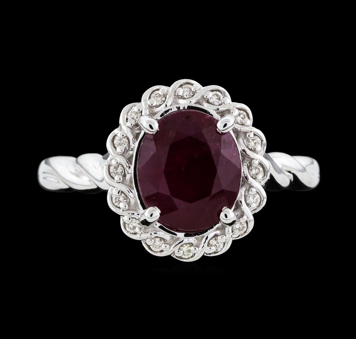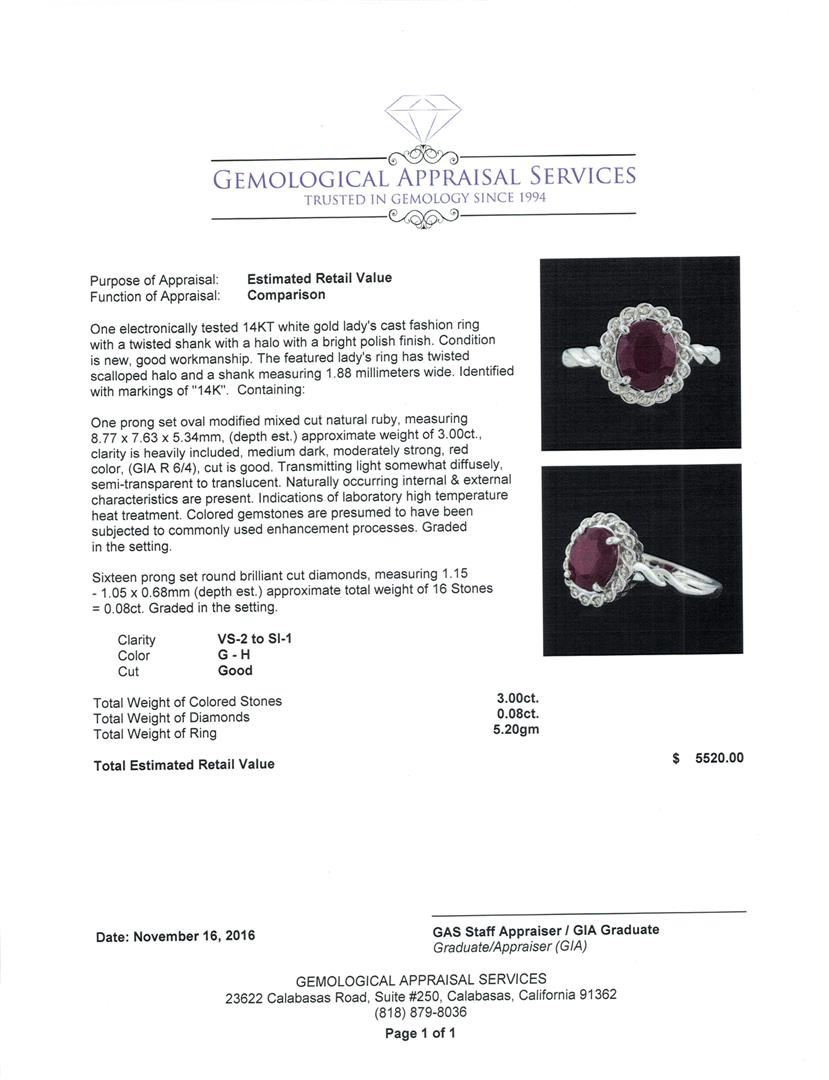 One electronically tested 14KT white gold lady's cast fashion ring with a twisted shank with a halo with a bright polish finish. The featured lady's ring has twisted scalloped halo and a shank measuring 1.88 millimeters wide. Identified with markings of '14K'. Condition is new, good workmanship. Containing: One prong set oval modified mixed cut natural ruby, measuring 8.77 x 7.63 x 5.34mm, (depth est.) approximate weight of 3.00ct., clarity is heavily included, medium dark, moderately strong, red color, (GIA R 6/4), cut is good. Transmitting light somewhat diffusely, semi-transparent to translucent. Naturally occurring internal & external characteristics are present. Indications of laboratory high temperature heat treatment. Colored gemstones are presumed to have been subjected to commonly used enhancement processes. Graded in the setting. Sixteen prong set round brilliant cut diamonds, measuring 1.15 - 1.05 x 0.68mm (depth est.) approximate total weight of 16 Stones = 0.08ct. Graded in the setting. Clarity VS-2 to SI-1. Color: G - H Cut Good. Total Weight of Colored Stones 3.00ct.. Total Weight of Diamonds 0.08ct.. Total Weight of Ring 5.20gm. GAS Appraised at $5,520.00.