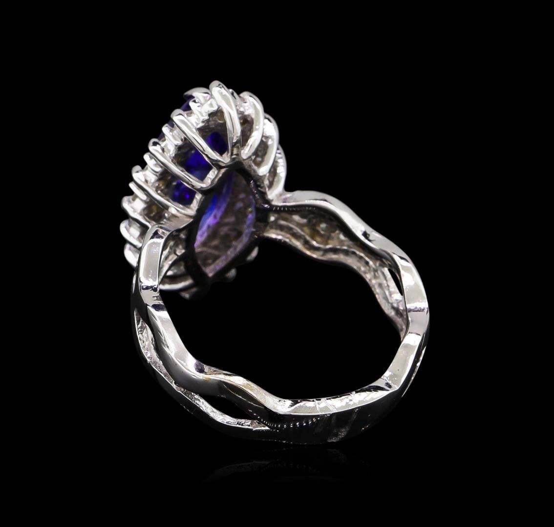 One electronically tested 14KT white gold ladies cast tanzanite and diamond ring with a bright polish finish. The featured tanzanite is set within a diamond bezel supported by a ribbed under gallery and stylized diamond accented shoulders, completed by a three millimeter wide band. Condition is new, good workmanship. Containing: One prong set marquise mixed cut natural tanzanite, measuring 13.50 x 6.70 x 5.10mm, approximate weight of 3.00ct., clarity is eye clean, type I, medium dark, moderately strong, violetish blue color, (GIA vB 6/4), cut is good. Transmitting light with no distortion, transparent. Graded in the setting. Tanzanite is a very rare gemstone that is only found in the country of Tanzania. Originally discovered in 1967. Tiffany & Company, named the stone Tanzanite. It is found in the Usumburu Mountains that border the Umba Valley of northern Tanzania. Tanzanite occurs in gray, brown, violet, blue, reddish-purple, & green. The gem is interesting because of its exceptional pleochroism. Rotated in different directions a tanzanite will exhibit multiple changes of color. Tanzanite has a low tolerance to ultrasonic cleaning, and should not be cleaned using this method. Eighteen prong set round brilliant cut diamonds approximate total weight of 18 Stones = 0.54ct. Graded in the setting. Clarity: SI-1 to SI-2. Color: E - G. Total Weight of Colored Stones 3.00ct. Total Weight of Diamonds 0.54ct. Total Weight of Ring 5.84gm. AIG Appraised at $8,750.00.