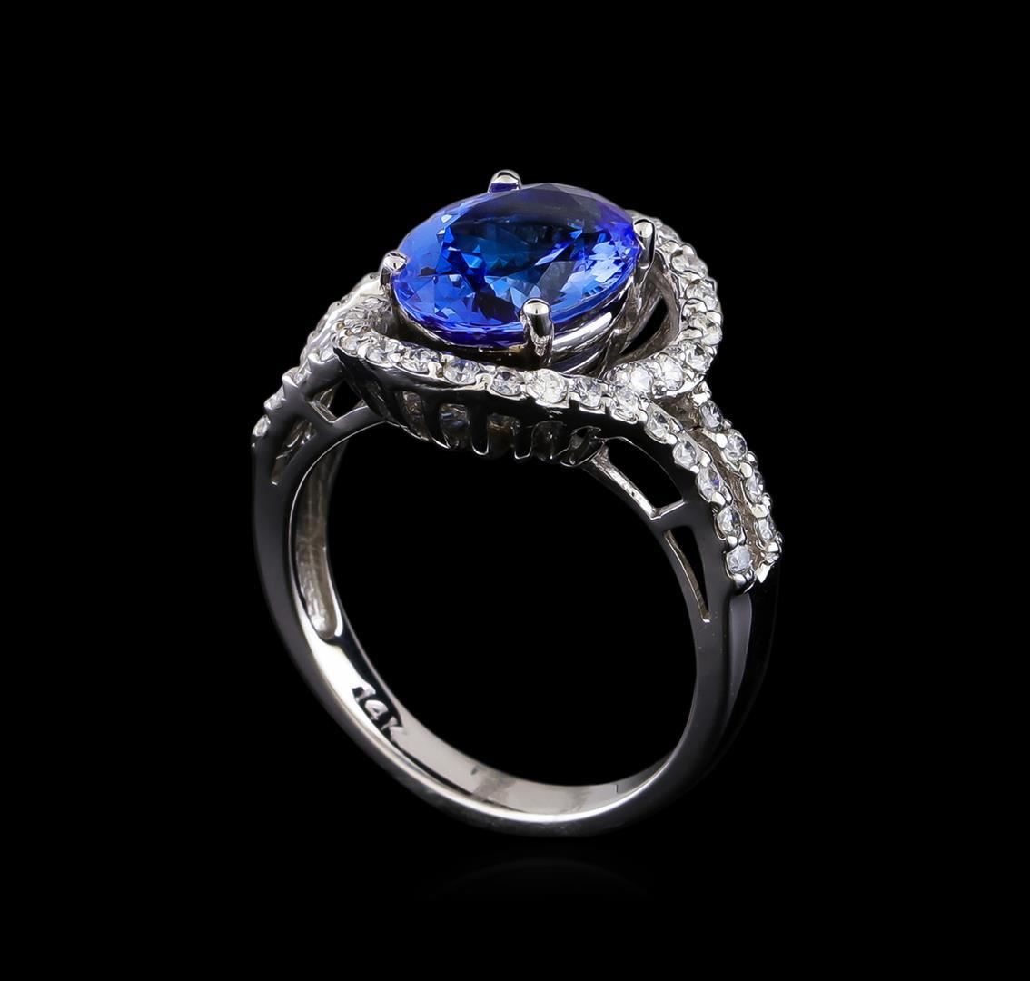 One electronically tested 14KT white gold lady's cast fashion ring with a split bypass shank with a bright polish finish. The featured lady's ring has a shank measuring 2.55 millimeters in width. Identified with markings of "14K". Condition is new, good workmanship. Containing: One prong set oval modified brilliant cut natural tanzanite, measuring 10.83 x 8.13 x 4.95mm, (depth est.) 8%. bulge factor, approximate weight of 3.00ct., clarity is eye clean, medium light, moderately strong, violetish blue color, (GIA vB 4/4), cut is very good. Transmitting light with no distortion, transparent. Colored gemstones are presumed to have been subjected to commonly used enhancement processes. Graded in the setting. Forty-Four prong set round brilliant cut diamonds, measuring 1.50 - 1.40 x 0.90mm (depth est.) approximate total weight of 44 Stones = 0.51ct. Graded in the setting. Clarity: SI-1 to SI-2. Color: H - I. Cut Good. Total Weight of Colored Stones 3.00ct. Total Weight of Diamonds 0.51ct. Total Weight of Ring 5.00gm.