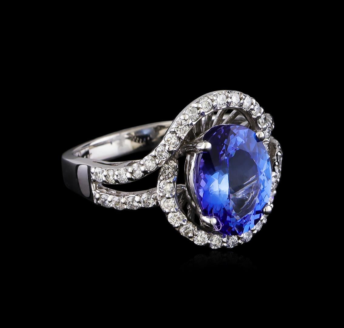 One electronically tested 14KT white gold lady's cast fashion ring with a split bypass shank with a bright polish finish. The featured lady's ring has a shank measuring 2.55 millimeters in width. Identified with markings of "14K". Condition is new, good workmanship. Containing: One prong set oval modified brilliant cut natural tanzanite, measuring 10.83 x 8.13 x 4.95mm, (depth est.) 8%. bulge factor, approximate weight of 3.00ct., clarity is eye clean, medium light, moderately strong, violetish blue color, (GIA vB 4/4), cut is very good. Transmitting light with no distortion, transparent. Colored gemstones are presumed to have been subjected to commonly used enhancement processes. Graded in the setting. Forty-Four prong set round brilliant cut diamonds, measuring 1.50 - 1.40 x 0.90mm (depth est.) approximate total weight of 44 Stones = 0.51ct. Graded in the setting. Clarity: SI-1 to SI-2. Color: H - I. Cut Good. Total Weight of Colored Stones 3.00ct. Total Weight of Diamonds 0.51ct. Total Weight of Ring 5.00gm.
