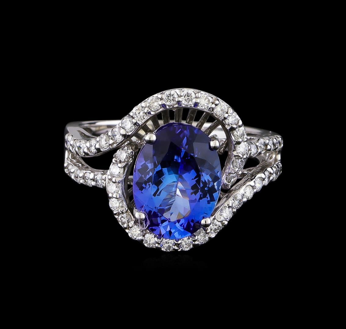 One electronically tested 14KT white gold lady's cast fashion ring with a split bypass shank with a bright polish finish. The featured lady's ring has a shank measuring 2.55 millimeters in width. Identified with markings of "14K". Condition is new, good workmanship. Containing: One prong set oval modified brilliant cut natural tanzanite, measuring 10.83 x 8.13 x 4.95mm, (depth est.) 8%. bulge factor, approximate weight of 3.00 ct., clarity is eye clean, medium light, moderately strong, violetish blue color, (GIA vB 4/4), cut is very good. Transmitting light with no distortion, transparent. Colored gemstones are presumed to have been subjected to commonly used enhancement processes. Graded in the setting. Forty-Four prong set round brilliant cut diamonds, measuring 1.50 - 1.40 x 0.90mm (depth est.) approximate total weight of 44 Stones = 0.51ct. Graded in the setting. Clarity: SI-1 to SI-2. Color: H - I. Cut Good. Total Weight of Colored Stones 3.00 ct. Total Weight of Diamonds 0.51ct. Total Weight of Ring 5.00gm.
