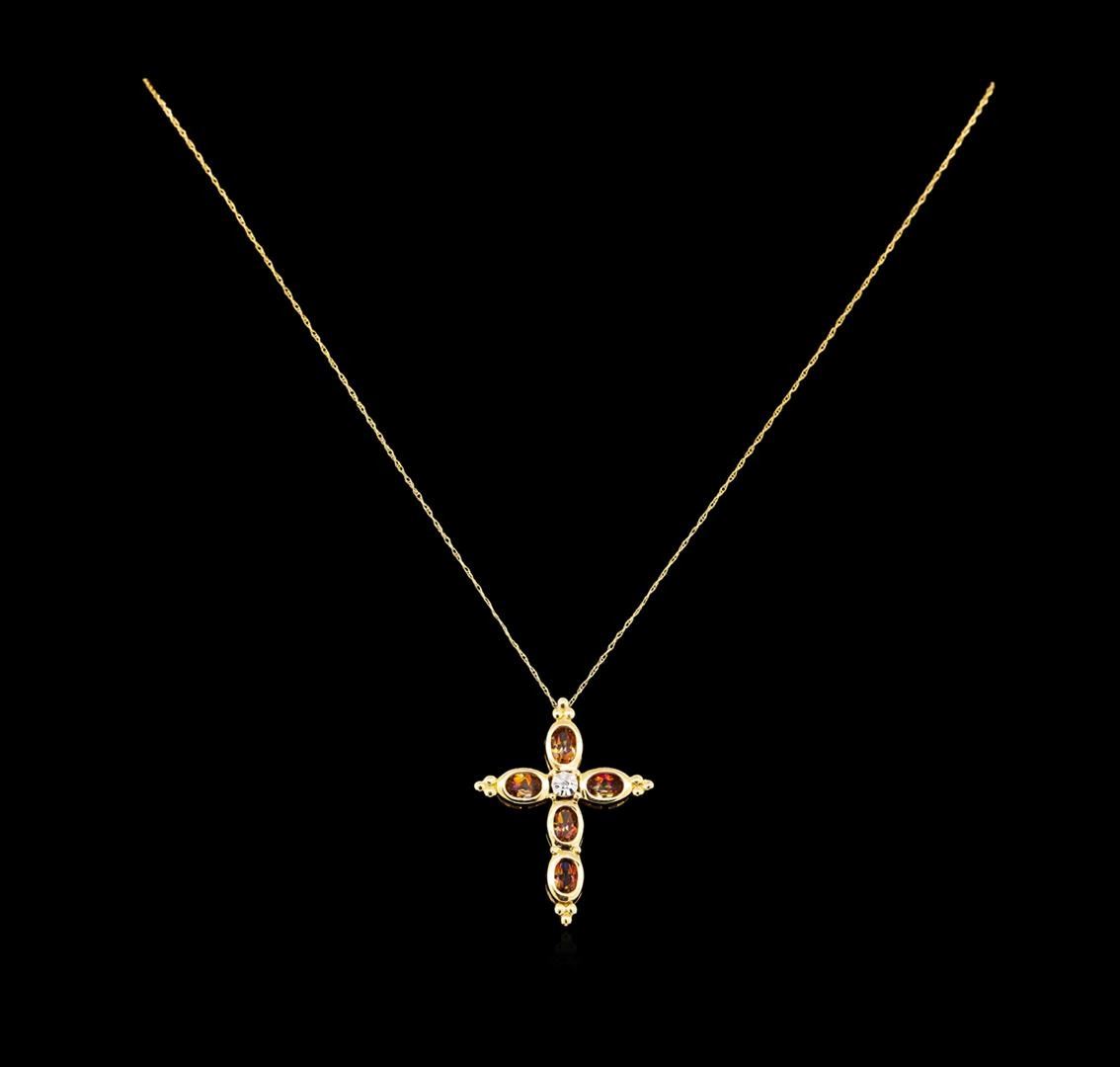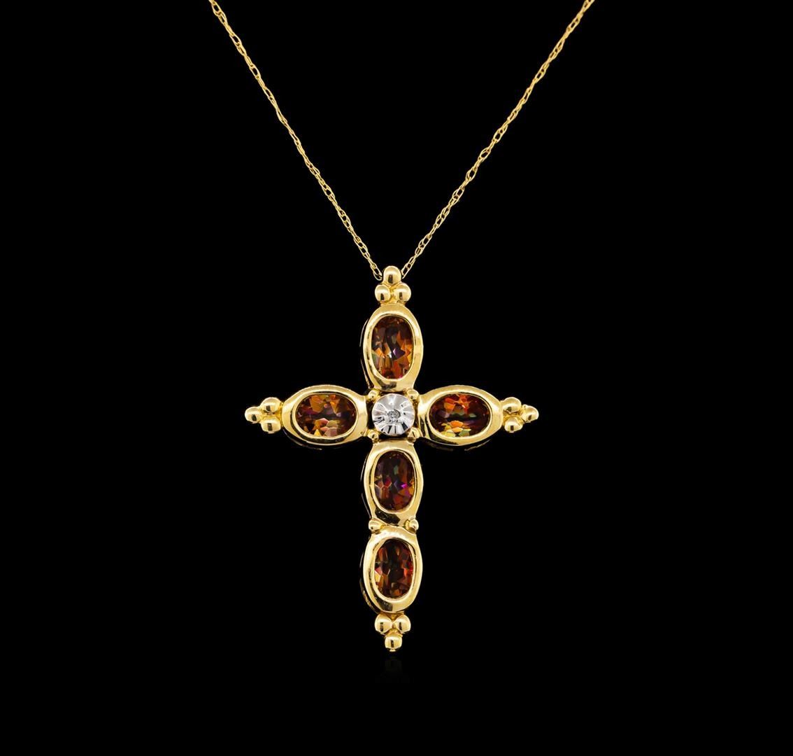 One 10KT yellow gold lady's combination cast & assembled cross pendant & chain 18.0" long, .75 loose rope chain with a spring ring clasp with a bright polish finish. Condition is new, good workmanship. Identified with markings of "10K". Containing: One prong set round brilliant cut diamond, measuring 1.30 - 1.26 x 0.79mm (depth est.) approximate weight of 0.01ct. Graded in the setting. Clarity: I-1. Color: H. Cut: Good. Five prong set oval modified brilliant cut natural azotic topazes, measuring 6.00 x 4.00 x 2.75mm, approximate total weight of 3.00ct., clarity is eye clean, medium, moderately strong, reddish orange color, (GIA rO 5/4), cut is very good. Graded in the setting. Total Weight of Colored Stones: 3.00ct. Total Weight of Diamonds: 0.01ct. Total Weight of Pendant & Chain: 3.40 grams.