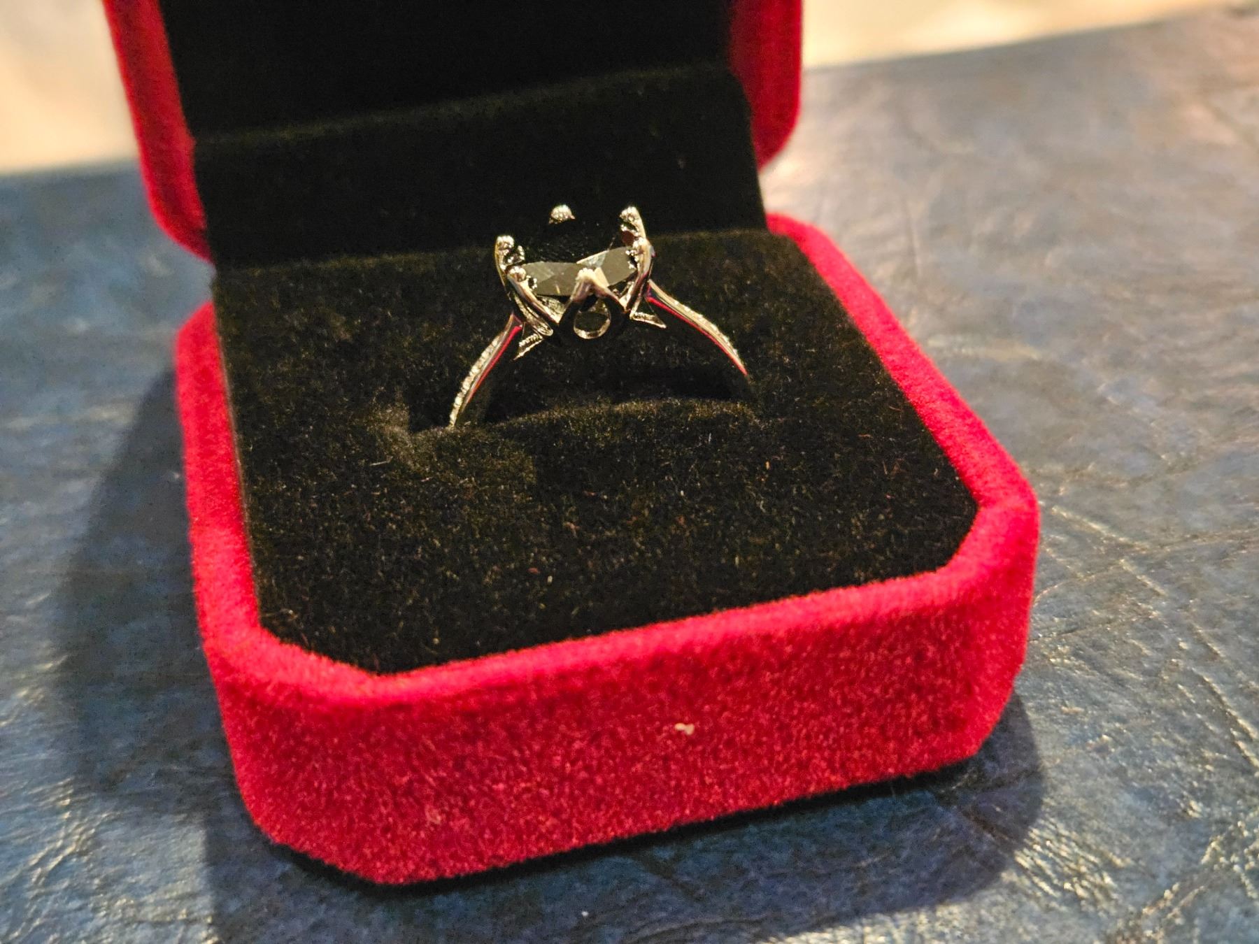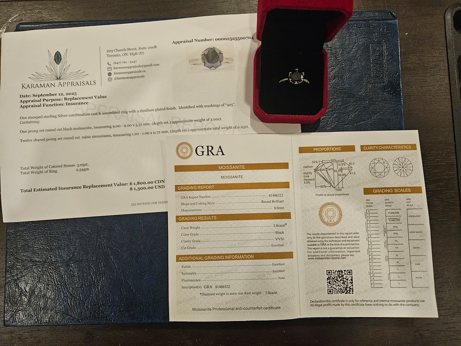 3.00 CT GRA CERTIFIED ROUND BRILLIANT CUT MOISSANITE STONE VVS BLACK COLOR WITH 12 ROUND BRILLIANT CUT CUBIC ZIRCONIA SET IN SHANKS SET IN 925 SILVER RING SIZE 7 RETAIL VALUE $1,800.00