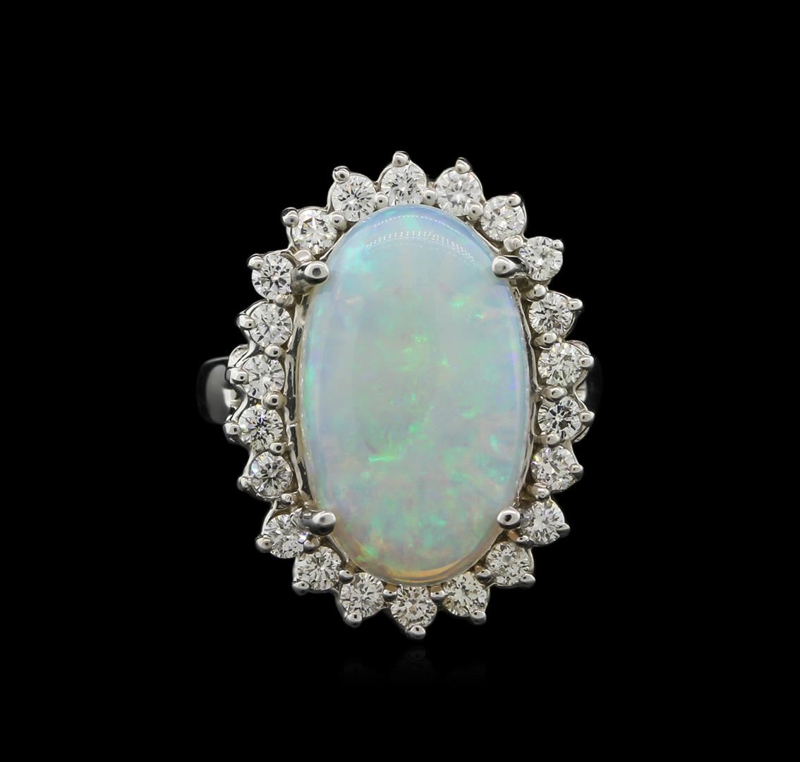 One electronically tested 14KT white gold ladies cast opal and diamond ring with a bright finish. The featured opal is set within a diamond bezel, supported by a ribbed under gallery, completed by a three millimeter wide band. Identified with markings of "14K". Condition is new, good workmanship. Containing: One semi crystal opal that is cut in a oval shaped cabochon and is prong set, measuring 17.00 mm long x 10.00 mm wide, and 3.90 mm thick and the approximate weight is 3.00 carats. The opal has a bright, green only play of color (fire) in a flashfire pattern; a medium dome; a good cut; slightly included; slight variation in base in its brightness and pattern; and is somewhat directional. Graded in the setting. Twenty-Two prong set round brilliant cut diamonds, measuring 2.10 - 2.00 x 1.23mm (depth est.) exact total weight 22 Stones = 0.70ct. Graded in the setting. Clarity SI-2 to I-1 Color G - I. Total Weight of Diamonds 0.70ct. Total Weight of Opals 3.00ct. Total Weight of Ring 6.78 grams. AIG Appraised at $3,610.00.