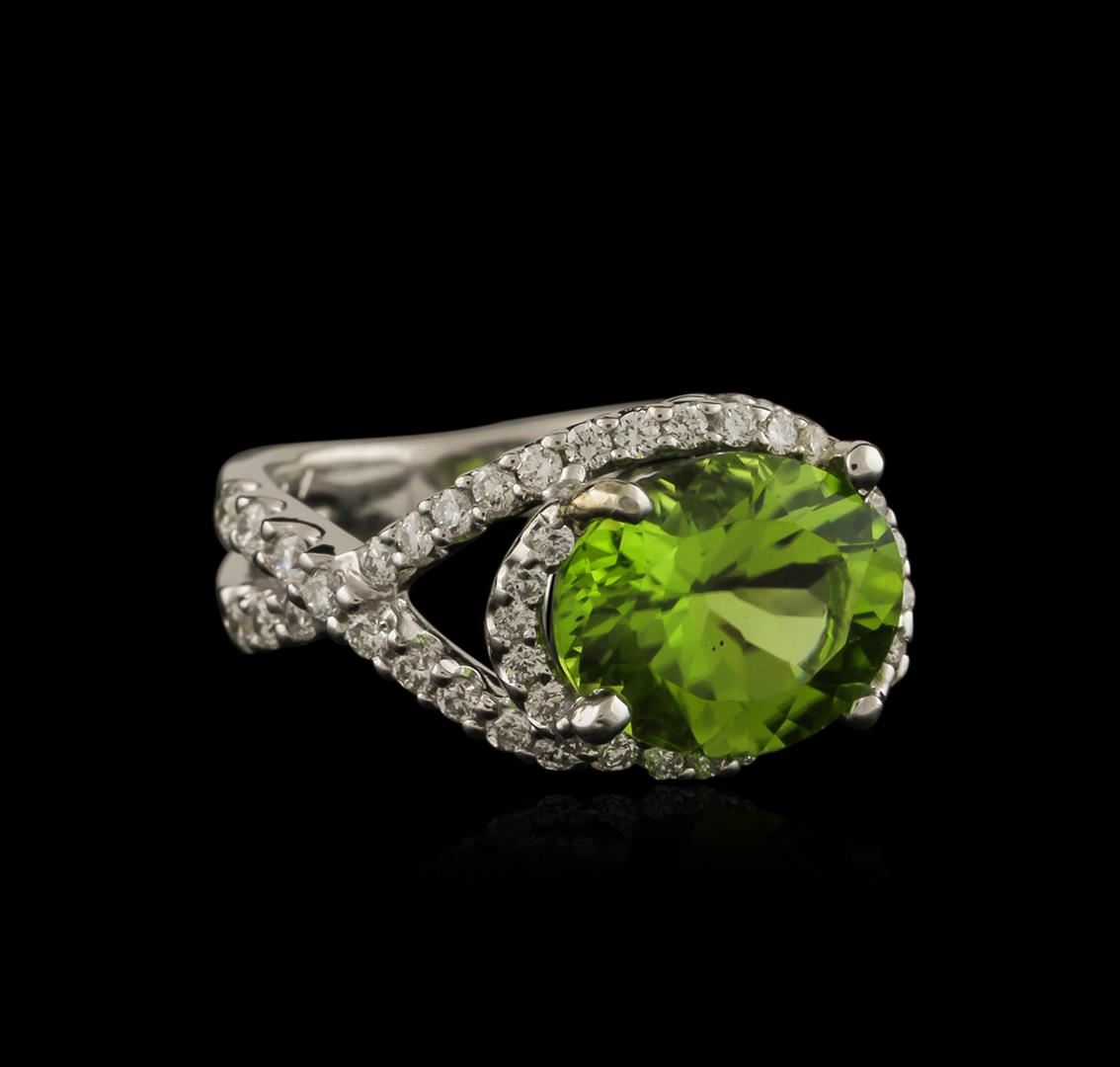 One ring featuring: 18KT white gold weighing 6.67 grams containing one prong set oval cut peridot center stone with a total weight of 3.00ct and prong set round diamonds with a total weight of 1.00ct.