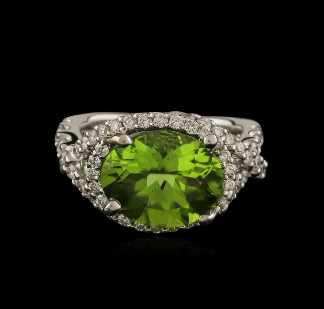 One ring featuring: 18KT white gold weighing 6.67 grams containing one prong set oval cut peridot center stone with a total weight of 3.00ct and prong set round diamonds with a total weight of 1.00ct.
