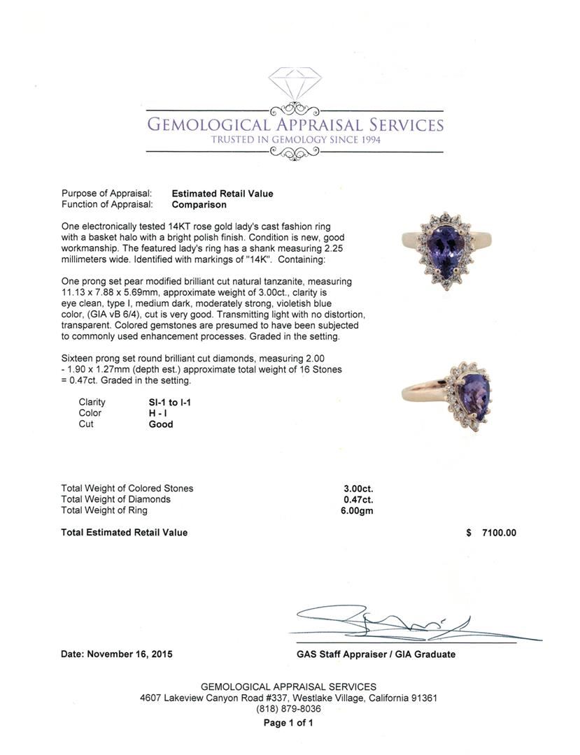 One electronically tested 14KT rose gold lady's cast fashion ring with a basket halo with a bright polish finish. The featured lady's ring has a shank measuring 2.25 millimeters wide. Identified with markings of "14K". Condition is new, good workmanship. Containing: One prong set pear modified brilliant cut natural tanzanite, measuring 11.13 x 7.88 x 5.69mm, approximate weight of 3.00ct., clarity is eye clean, type I, medium dark, moderately strong, violetish blue color, (GIA vB 6/4), cut is very good. Transmitting light with no distortion, transparent. Colored gemstones are presumed to have been subjected to commonly used enhancement processes. Graded in the setting. Sixteen prong set round brilliant cut diamonds, measuring 2.00 - 1.90 x 1.27mm (depth est.) approximate total weight of 16 Stones = 0.47ct. Graded in the setting. Clarity: SI-1 to I-1. Color: H - I. Cut Good. Total Weight of Colored Stones 3.00ct. Total Weight of Diamonds 0.47ct. Total Weight of Ring 6.00gm. GAS Appraised at $7,100.00.
