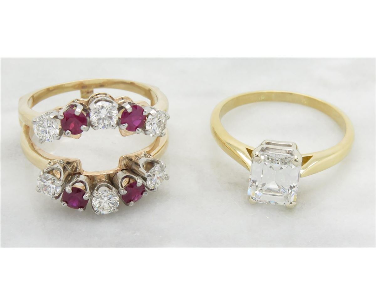 One tested 18K yellow gold diamond ring and wrap. Containing: One Emerald Cut Diamond. Approximate size: 2.00CT. Clarity: VS2, Color: F-G. The wrap consists of 6 Round Brilliant Cut Diamonds and 4 round rubies. Approximate total ruby weight: .80CTW. Approximate total diamond weight in wrap: 1.00CTW. Diamonds are graded in the mounting, unless otherwise stated. Weight: 10.0 grams, Size: 8.0.