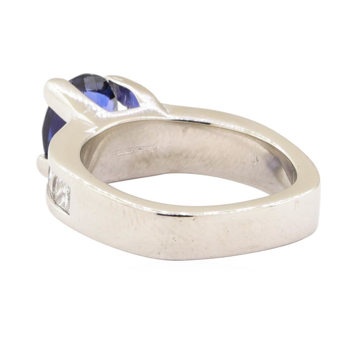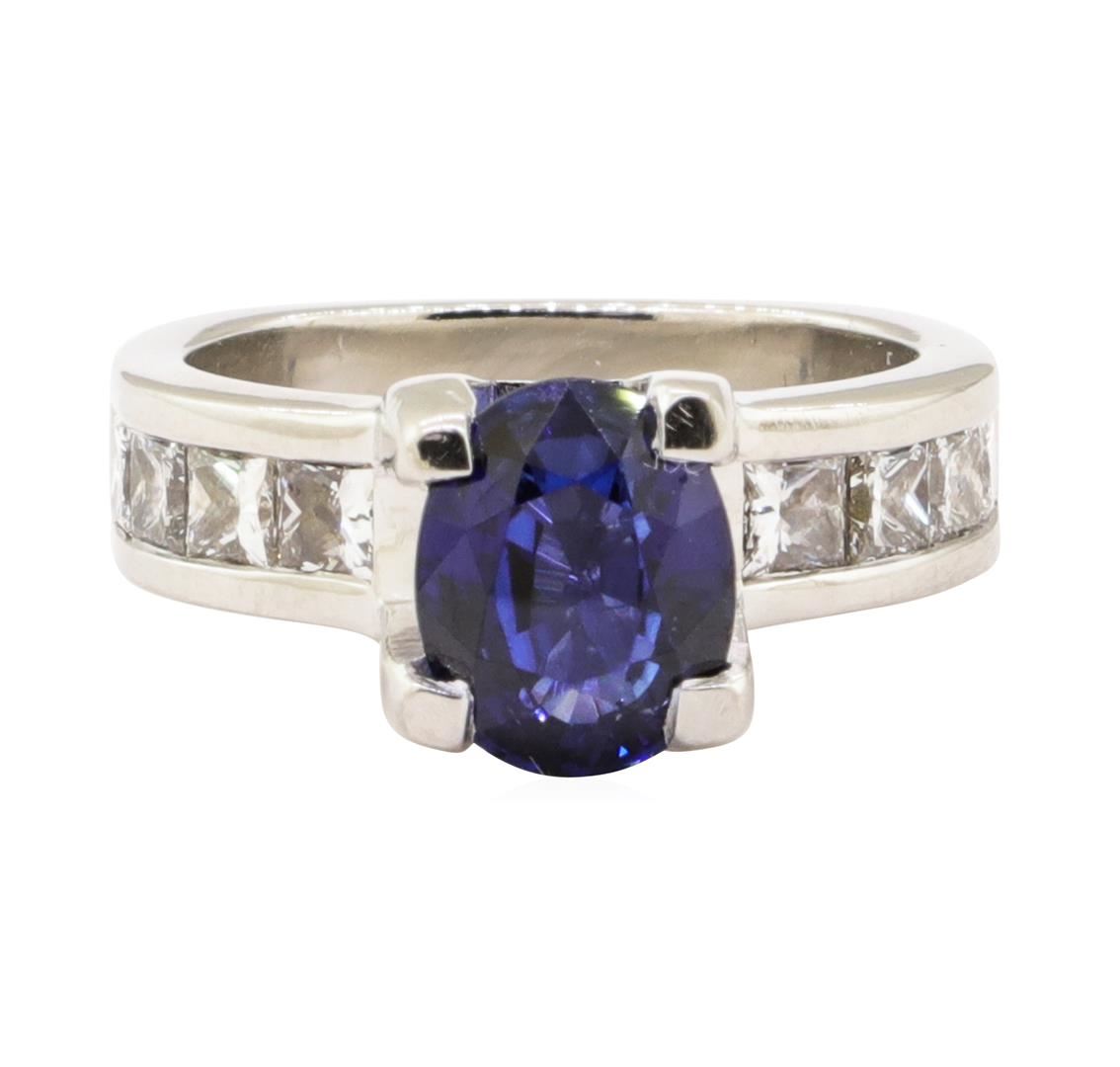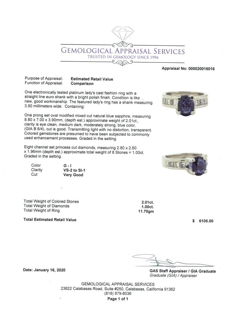 One electronically tested platinum lady's cast fashion ring with a straight line euro shank with a bright polish finish. The featured lady's ring has a shank measuring 3.90 millimeters wide. Condition is like new, good workmanship. Containing: One prong set oval modified mixed cut natural blue sapphire, measuring 8.80 x 7.00 x 3.90mm, (depth est.) approximate weight of 2.01ct., clarity is eye clean, medium dark, moderately strong, blue color, (GIA B 6/4), cut is good. Transmitting light with no distortion, transparent. Colored gemstones are presumed to have been subjected to commonly used enhancement processes. Graded in the setting. Eight channel set princess cut diamonds, measuring 2.80 x 2.60 x 1.96mm (depth est.) approximate total weight of 8 Stones = 1.00ct. Graded in the setting. Color G - I Clarity VS-2 to SI-1 Cut Very Good. Total Weight of Colored Stones 2.01ct.. Total Weight of Diamonds 1.00ct.. Total Weight of Ring 11.70gm GAS Appraised at $6105.00. GAS Appraised.