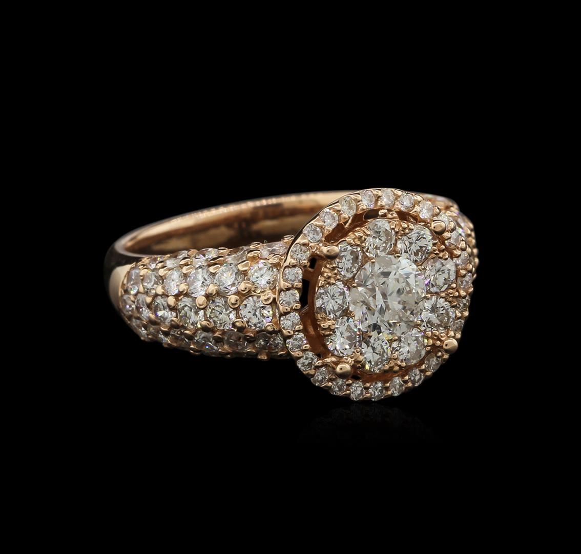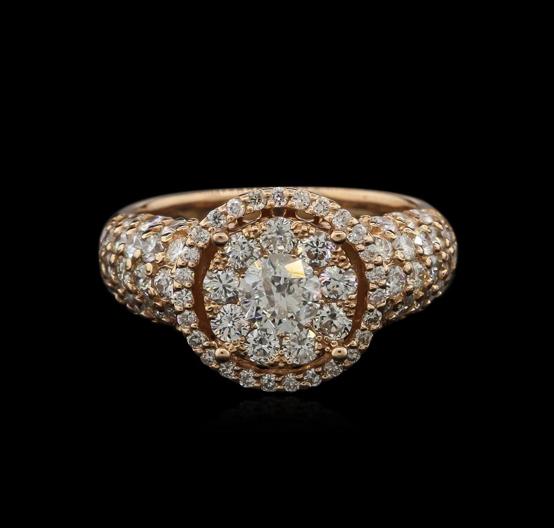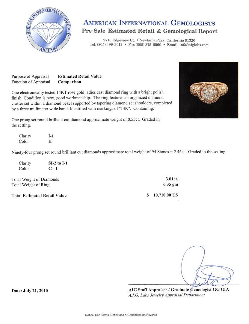 One electronically tested 14KT rose gold ladies cast diamond ring with a bright polish finish. The ring features an organized diamond cluster set within a diamond bezel supported by tapering diamond set shoulders, completed by a three millimeter wide band. Identified with markings of "14K". Condition is new, good workmanship. Containing: One prong set round brilliant cut diamond approximate weight of 0.55ct. Graded in the setting. Clarity I-1 Color H Ninety-Four prong set round brilliant cut diamonds approximate total weight of 94 Stones = 2.46ct. Graded in the setting. Clarity SI-2 to I-1 Color G - I. Total Weight of Diamonds 3.01ct. Total Weight of Ring 6.35 grams. AIG Appraised at $10,710.00.
