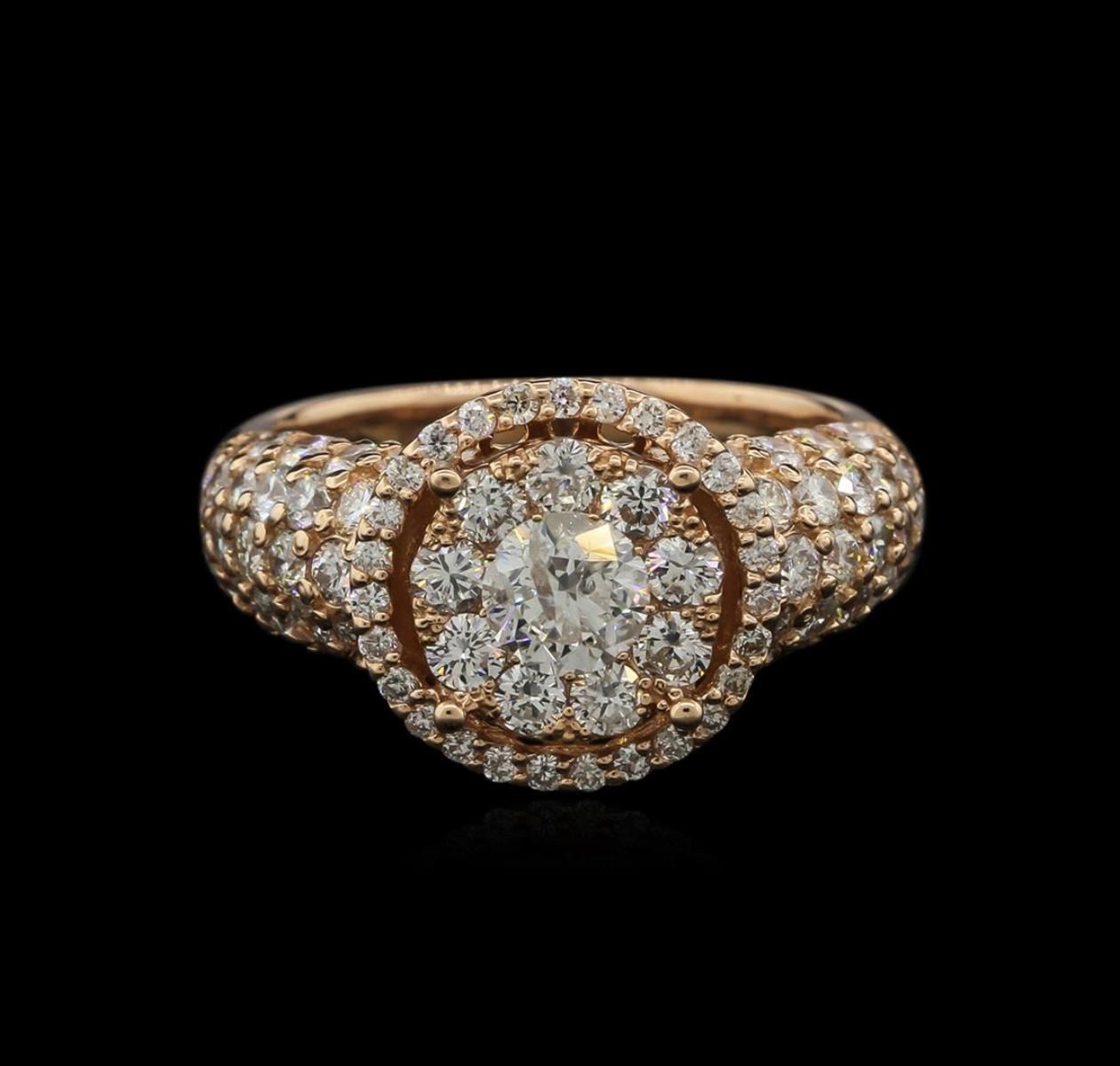 One electronically tested 14KT rose gold ladies cast diamond ring with a bright polish finish. The ring features an organized diamond cluster set within a diamond bezel supported by tapering diamond set shoulders, completed by a three millimeter wide band. Identified with markings of "14K". Condition is new, good workmanship. Containing: One prong set round brilliant cut diamond approximate weight of 0.55ct. Graded in the setting. Clarity I-1 Color H Ninety-Four prong set round brilliant cut diamonds approximate total weight of 94 Stones = 2.46ct. Graded in the setting. Clarity SI-2 to I-1 Color G - I. Total Weight of Diamonds 3.01ct. Total Weight of Ring 6.35 grams. AIG Appraised.