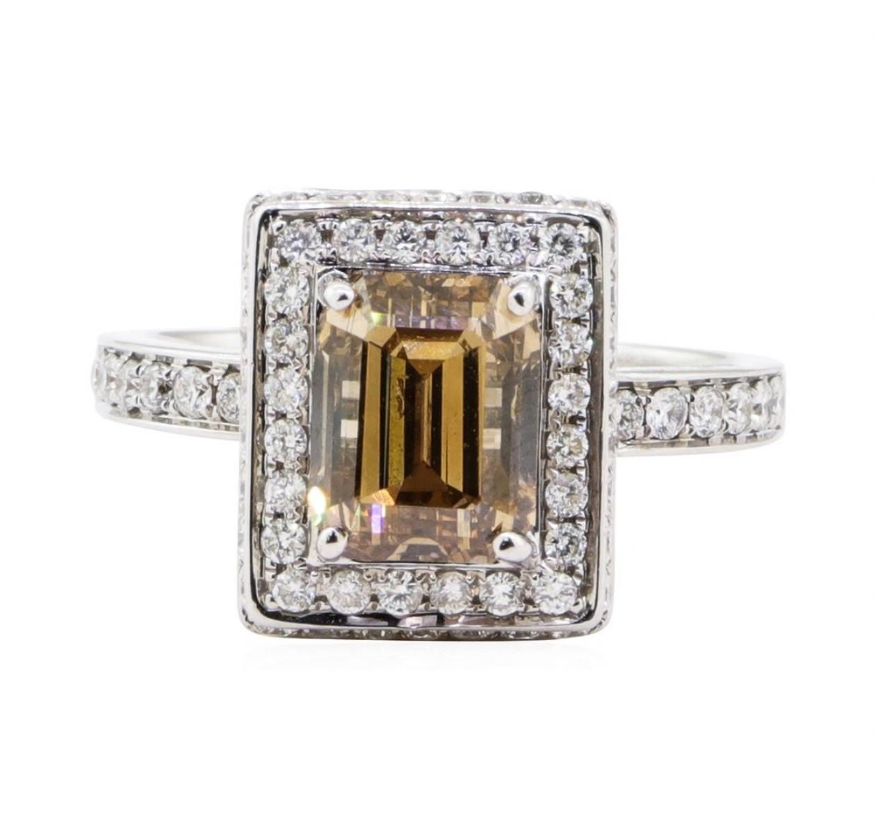 One electronically tested 14KT white gold ladies cast diamond ring. The featured diamond is set within a diamond bezel, supported by diamond set shoulders and completed by a two millimeter wide band. Trademark is ORIANNE. Identified with markings of "14K". Condition is new, good workmanship. Containing: One emerald shaped cut diamond, measuring 8.47 x 6.63 x 5.58mm exact weight 3.01ct with a faint blue fluorescence. Graded loose prior to setting in the EGL Laboratory, Report # US 904043617D. Clarity SI-1 Depth 84.2% Table 55.0% Pavil. Depth% 56.9% Seventy-Four bead set round brilliant cut diamonds, measuring 1.50 - 1.30 x 0.84mm (depth est.) approximate total weight of 74 Stones = 0.79ct. Graded in the setting. Clarity SI-2 to I-1 Color F - H Total Weight of Diamonds 3.80 ct. Estimated Retail Value $ 62,100.00 US