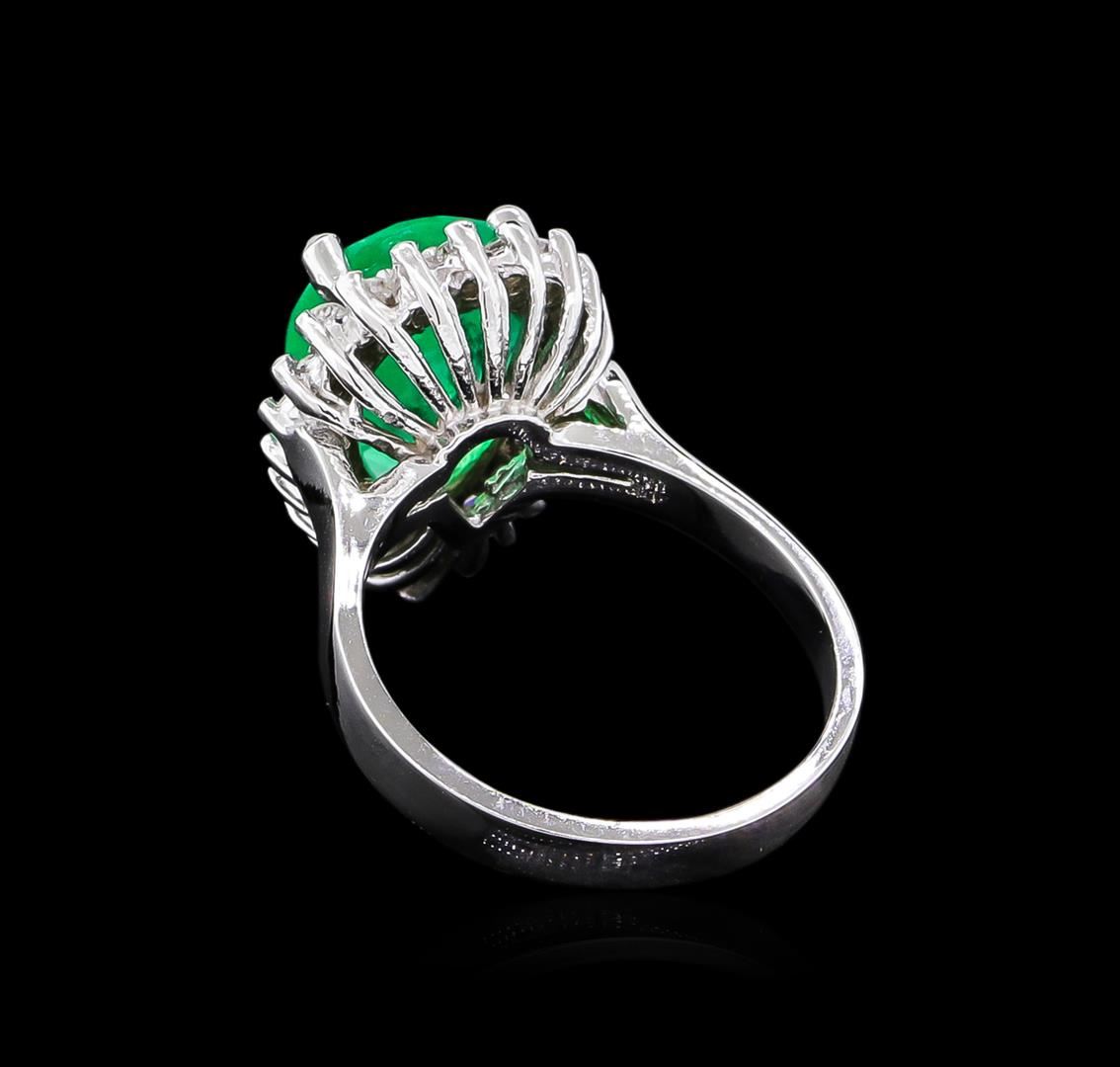 One electronically tested 14KT white gold lady's cast fashion ring with a basket halo with a bright polish finish. The featured lady's ring has a shank measuring 2.74 millimeters wide. Identified with markings of "14K". Condition is new, good workmanship. Containing: One prong set pear modified brilliant cut natural emerald, measuring 12.70 x 9.14 x 4.69mm, approximate weight of 3.01ct., clarity is moderately included, type III, medium, moderately strong, green color, (GIA G 5/4), cut is good. Transmitting light somewhat diffusely, transparent to translucent. Indications of oil residue. Naturally occurring internal & external characteristics are present. Graded in the setting. Twenty-Two prong set round brilliant cut diamonds, measuring 1.85 - 1.75 x 1.10mm (depth est.) approximate total weight of 22 Stones = 0.48ct. Graded in the setting. Clarity: SI-1 to I-1. Color: G - Good. Total Weight of Colored Stones 3.01ct. Total Weight of Diamonds 0.48ct. Total Weight of Ring 6.00gm. GAS Appraised at $7,560.00.
