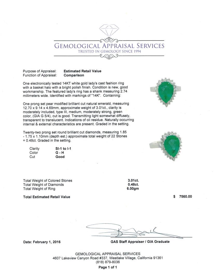 One electronically tested 14KT white gold lady's cast fashion ring with a basket halo with a bright polish finish. The featured lady's ring has a shank measuring 2.74 millimeters wide. Identified with markings of "14K". Condition is new, good workmanship. Containing: One prong set pear modified brilliant cut natural emerald, measuring 12.70 x 9.14 x 4.69mm, approximate weight of 3.01ct., clarity is moderately included, type III, medium, moderately strong, green color, (GIA G 5/4), cut is good. Transmitting light somewhat diffusely, transparent to translucent. Indications of oil residue. Naturally occurring internal & external characteristics are present. Graded in the setting. Twenty-Two prong set round brilliant cut diamonds, measuring 1.85 - 1.75 x 1.10mm (depth est.) approximate total weight of 22 Stones = 0.48ct. Graded in the setting. Clarity: SI-1 to I-1. Color: G - Good. Total Weight of Colored Stones 3.01ct. Total Weight of Diamonds 0.48ct. Total Weight of Ring 6.00gm. GAS Appraised at $7,560.00.