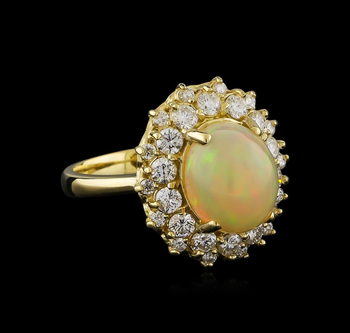 One electronically tested 14KT yellow gold lady's cast fashion ring with a double basket halo with a bright polish finish. The featured lady's ring has a shank measuring 2.86 millimeters wide. Identified with markings of "K14". Condition is new, good workmanship. Containing: One crystal opal that is cut in a oval shaped cabochon and is prong set, measuring 11.00 mm long x 9.19 mm wide, and 6.38 mm thick and the approximate weight is 3.01 carats. The opal has a bright, green-orange play of color (fire) in a rolling flashfire pattern; a high dome; a good cut; no inclusions; consistent in its brightness and pattern; and is not directional. Graded in the setting. Fourteen prong set round brilliant cut diamonds, measuring 2.80 - 2.70 x 1.65mm (depth est.) approximate total weight of 14 Stones = 1.06ct. Graded in the setting. Clarity: SI-1 to SI-2. Color: G - Good Fourteen prong set round brilliant cut diamonds, measuring 1.60 - 1.55 x 0.98mm (depth est.) approximate total weight of 14 Stones = 0.21ct. Graded in the setting. Clarity: SI-1 to SI-2. Color: H - I. Cut Good. Total Weight of Diamonds 1.27ct. Total Weight of Opals 3.01ct. Total Weight of Ring 6.80gm. GAS Appraised.