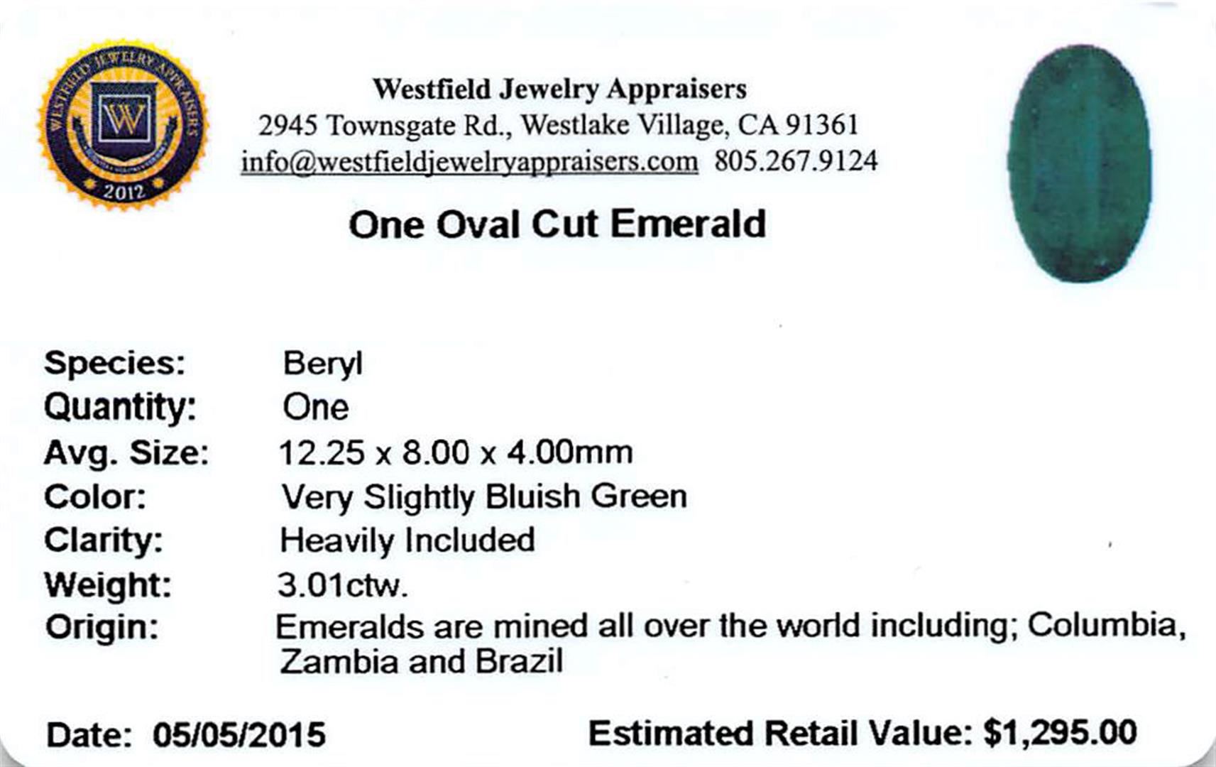 One oval mixed cut natural emerald, measuring 12.25 x 8.00 x 4.00mm, exact weight 3.01ct., clarity is heavily included, type III, medium dark, very slightly grayish, very slightly bluish green color, (GIA vslbG 6/3) Indications of multiple laboratory enhancements, including high temperature heat treatment. Westfield Appraised at $1,295.00.
