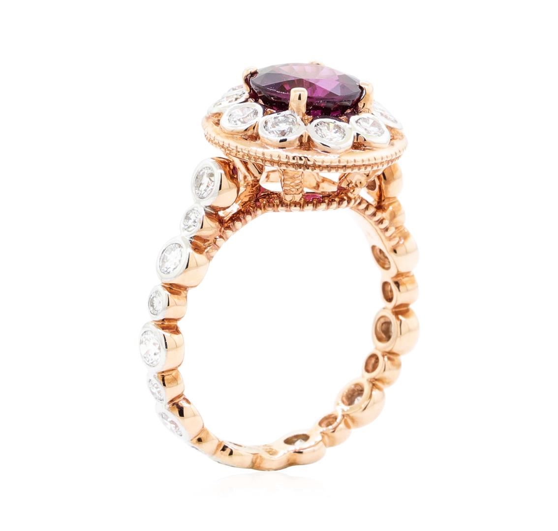 One electronically tested 14KT rose gold lady's cast fashion ring with a scalloped shank with a bright polish finish. The featured lady's ring has a shank measuring 2.76 millimeters wide. Identified with markings of '14K'. Condition is new, good workmanship. Containing: One prong set round modified mixed cut natural rhodolite garnet, measuring 7.45 - 7.42 x 4.60 mm, (depth est.) 5%. bulge factor, approximate weight of 2.07ct., clarity is eye clean, medium dark, strong, strongly purplish red color, (GIA stpR 6/5), cut is good. Transmitting light with no distortion, transparent. Colored gemstones are presumed to have been subjected to commonly used enhancement processes. Graded in the setting. Twenty bezel set round brilliant cut diamonds, measuring 2.20 - 2.15 x 1.35mm (depth est.) approximate total weight of 20 Stones = 0.78ct. Graded in the setting. Color H - I Clarity SI-1 to SI-2 Cut Good Eight bezel set round brilliant cut diamonds, measuring 1.80 - 1.70 x 1.09mm (depth est.) approximate total weight of 8 Stones = 0.16ct. Graded in the setting. Color H - I Clarity SI-1 to SI-2 Cut Good. Total Weight of Colored Stones 2.07ct.. Total Weight of Diamonds 0.94ct.. Total Weight of Ring 5.90gm GAS Appraised at $3650.00. GAS Appraised.
