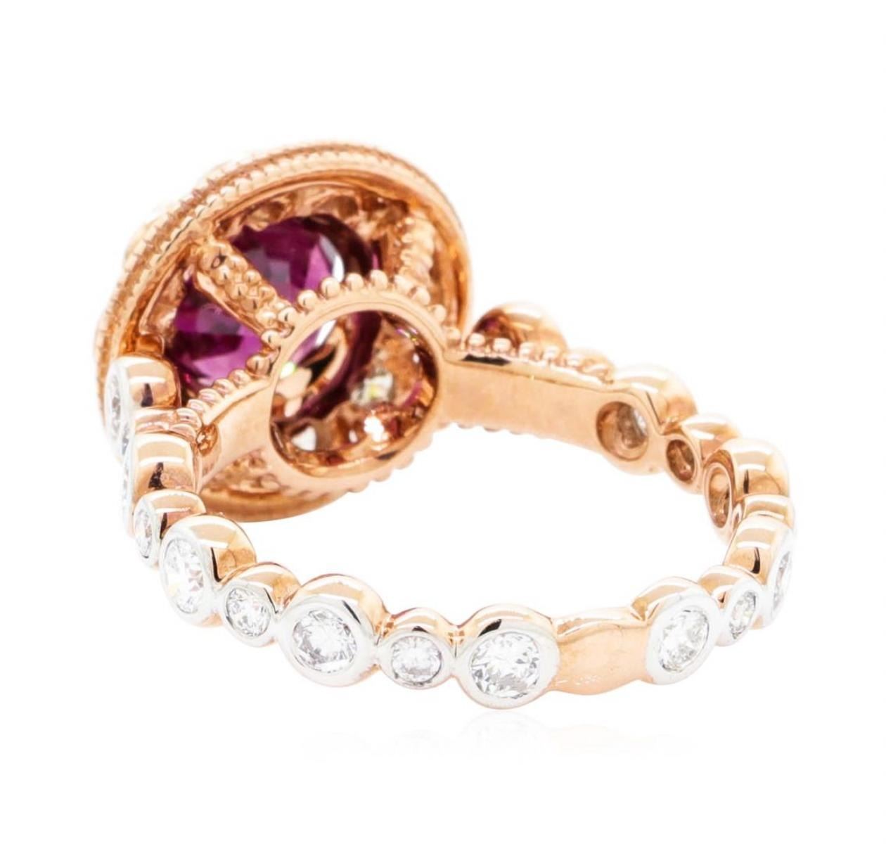 One electronically tested 14KT rose gold lady's cast fashion ring with a scalloped shank with a bright polish finish. The featured lady's ring has a shank measuring 2.76 millimeters wide. Identified with markings of '14K'. Condition is new, good workmanship. Containing: One prong set round modified mixed cut natural rhodolite garnet, measuring 7.45 - 7.42 x 4.60 mm, (depth est.) 5%. bulge factor, approximate weight of 2.07ct., clarity is eye clean, medium dark, strong, strongly purplish red color, (GIA stpR 6/5), cut is good. Transmitting light with no distortion, transparent. Colored gemstones are presumed to have been subjected to commonly used enhancement processes. Graded in the setting. Twenty bezel set round brilliant cut diamonds, measuring 2.20 - 2.15 x 1.35mm (depth est.) approximate total weight of 20 Stones = 0.78ct. Graded in the setting. Color H - I Clarity SI-1 to SI-2 Cut Good Eight bezel set round brilliant cut diamonds, measuring 1.80 - 1.70 x 1.09mm (depth est.) approximate total weight of 8 Stones = 0.16ct. Graded in the setting. Color H - I Clarity SI-1 to SI-2 Cut Good. Total Weight of Colored Stones 2.07ct.. Total Weight of Diamonds 0.94ct.. Total Weight of Ring 5.90gm GAS Appraised at $3650.00. GAS Appraised.