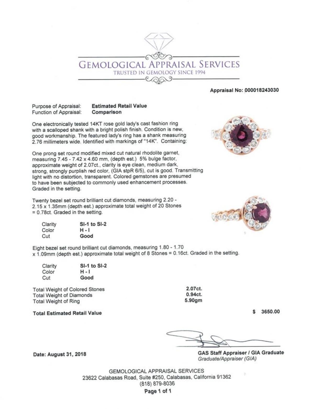 One electronically tested 14KT rose gold lady's cast fashion ring with a scalloped shank with a bright polish finish. The featured lady's ring has a shank measuring 2.76 millimeters wide. Identified with markings of '14K'. Condition is new, good workmanship. Containing: One prong set round modified mixed cut natural rhodolite garnet, measuring 7.45 - 7.42 x 4.60 mm, (depth est.) 5%. bulge factor, approximate weight of 2.07ct., clarity is eye clean, medium dark, strong, strongly purplish red color, (GIA stpR 6/5), cut is good. Transmitting light with no distortion, transparent. Colored gemstones are presumed to have been subjected to commonly used enhancement processes. Graded in the setting. Twenty bezel set round brilliant cut diamonds, measuring 2.20 - 2.15 x 1.35mm (depth est.) approximate total weight of 20 Stones = 0.78ct. Graded in the setting. Color H - I Clarity SI-1 to SI-2 Cut Good Eight bezel set round brilliant cut diamonds, measuring 1.80 - 1.70 x 1.09mm (depth est.) approximate total weight of 8 Stones = 0.16ct. Graded in the setting. Color H - I Clarity SI-1 to SI-2 Cut Good. Total Weight of Colored Stones 2.07ct.. Total Weight of Diamonds 0.94ct.. Total Weight of Ring 5.90gm GAS Appraised at $3650.00. GAS Appraised.