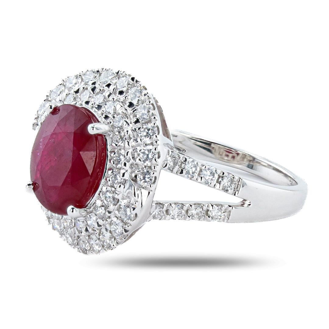 One polished, stamped, and tested platinum ring marked Aaron Gottlieb. The ring is mounted with: 1 genuine GIA certified ruby center stone weighing 3.01 carats, and 58 genuine round diamonds weighing approximately 0.95 carats. This item weighs 7.2 grams, condition is new, excellent workmanship. #MAIN GEMSTONE# GIA Report No.: 2235396211 Species: Natural Corundum Variety: Ruby Shape: Oval Cutting Style: Brilliant Cut Crown, Step Cut Pavilion Measurements: 9.27 x 8.30 x 3.80mm Weight: 3.01 carats Color: Red Transparency: Transparent to Semi Transparent Treatment: Heat with Residues Refractive Index: 1.762 - 1.770 DR Birefringence: 0.008 - 0.010 Hardness: 9 #ADJACENT GEMSTONES ON RING# Identity: Natural Diamond Shape: Round Cutting Style: Brilliant Cut Quantity: 58 Diamonds Measurements: 1.5 - 1.7mm Total Weight: 0.95 carats Clarity Grade: VS2-SI1 Color Grade: F-G Refractive Index: 2.417 Hardness: 10 RUBY WEIGHT: 3.01 ct TOTAL DIAMOND WEIGHT: 0.95 cts WEIGHT OF ITEM: 7.2 grams METAL: Platinum Size: 7