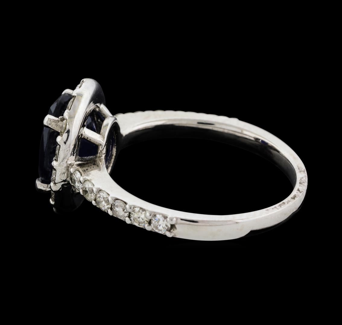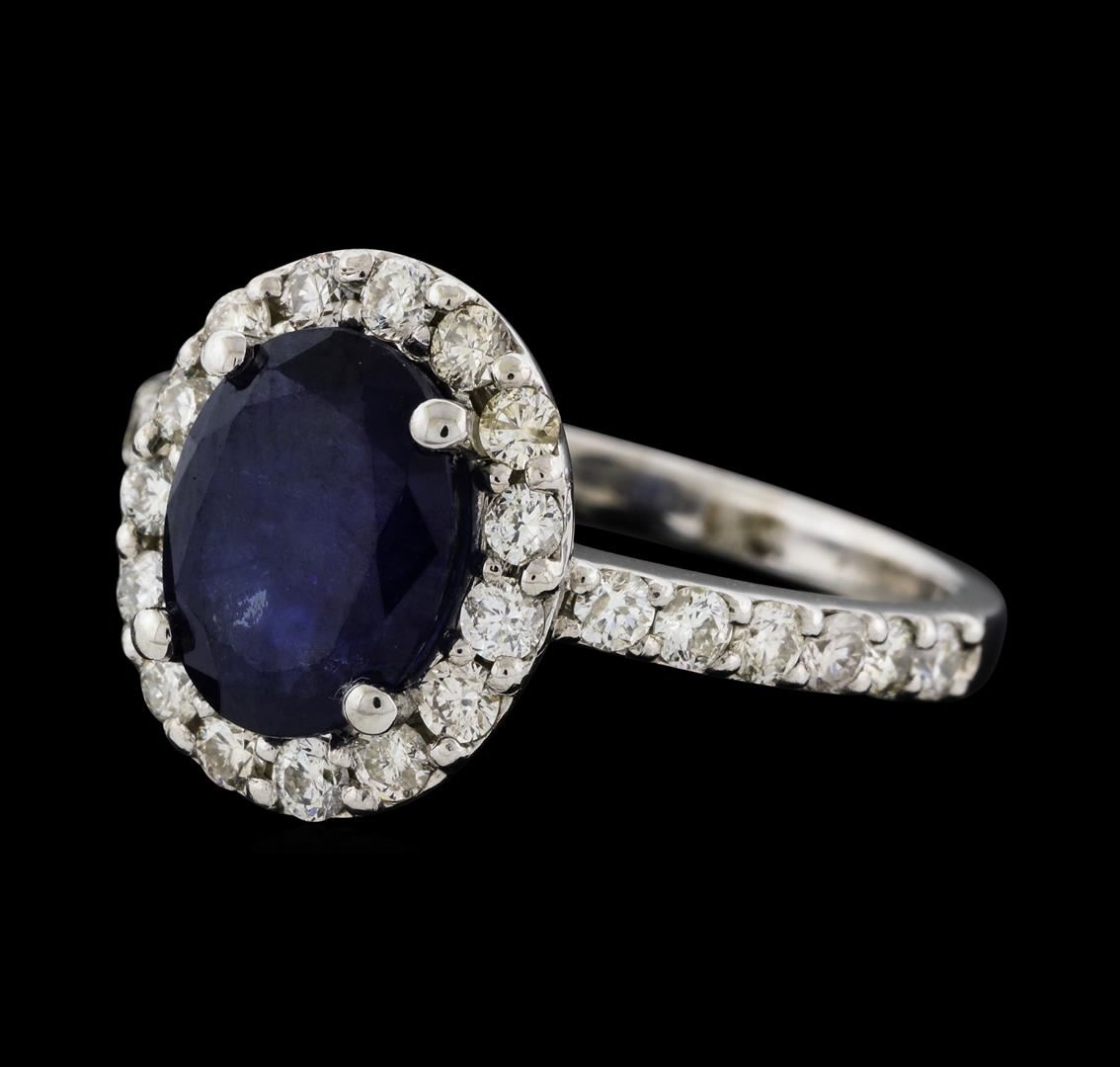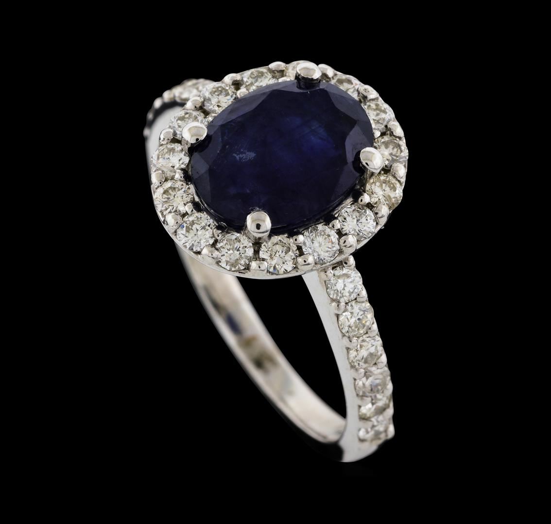 One electronically tested 14KT white gold lady's cast fashion ring with a halo with a bright polish finish. The featured lady's ring has a shank measuring 2.02 millimeters wide. Identified with markings of '14K'. Condition is new, good workmanship. Containing: One prong set oval modified mixed cut natural blue sapphire, measuring 9.30 x 7.20 x 4.72mm, (depth est.) 15%. bulge factor, approximate weight of 3.01ct., clarity is heavily included, medium dark, very slightly grayish, blue color, (GIA B 6/3), cut is good. Transmitting light somewhat diffusely, semi-transparent to translucent. Colored gemstones are presumed to have been subjected to commonly used enhancement processes. Graded in the setting. Twenty-Seven prong set round brilliant cut diamonds, measuring 2.00 - 1.90 x 1.17mm (depth est.) approximate total weight of 27 Stones = 0.73ct. Graded in the setting. Clarity SI-1 to SI-2. Color: H - I Cut Good. Total Weight of Colored Stones 3.01ct.. Total Weight of Diamonds 0.73ct.. Total Weight of Ring 4.20gm. GAS Appraised at $5,495.00.
