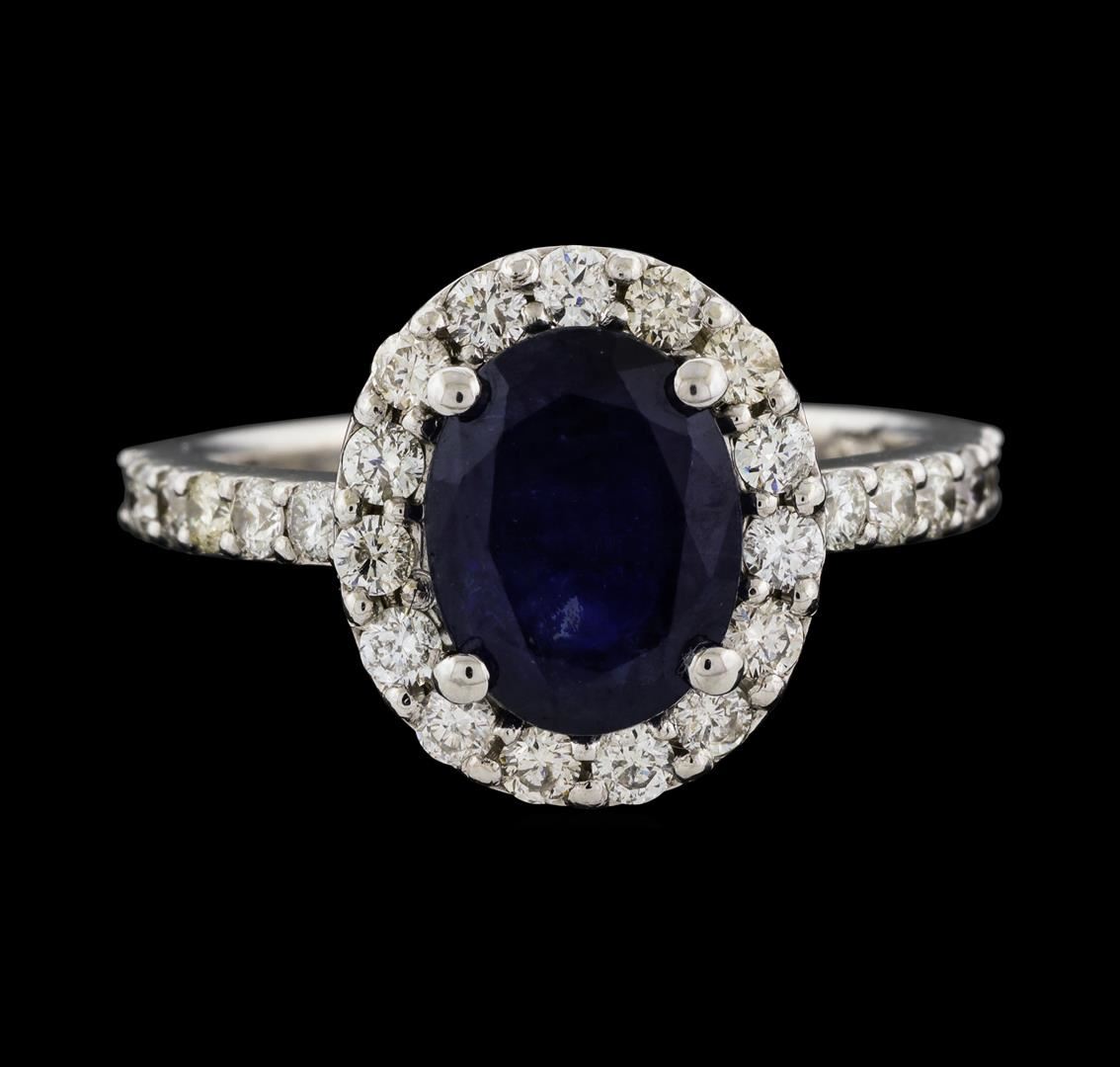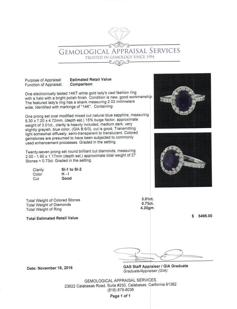 One electronically tested 14KT white gold lady's cast fashion ring with a halo with a bright polish finish. The featured lady's ring has a shank measuring 2.02 millimeters wide. Identified with markings of '14K'. Condition is new, good workmanship. Containing: One prong set oval modified mixed cut natural blue sapphire, measuring 9.30 x 7.20 x 4.72mm, (depth est.) 15%. bulge factor, approximate weight of 3.01ct., clarity is heavily included, medium dark, very slightly grayish, blue color, (GIA B 6/3), cut is good. Transmitting light somewhat diffusely, semi-transparent to translucent. Colored gemstones are presumed to have been subjected to commonly used enhancement processes. Graded in the setting. Twenty-Seven prong set round brilliant cut diamonds, measuring 2.00 - 1.90 x 1.17mm (depth est.) approximate total weight of 27 Stones = 0.73ct. Graded in the setting. Clarity SI-1 to SI-2. Color: H - I Cut Good. Total Weight of Colored Stones 3.01ct.. Total Weight of Diamonds 0.73ct.. Total Weight of Ring 4.20gm. GAS Appraised at $5,495.00.
