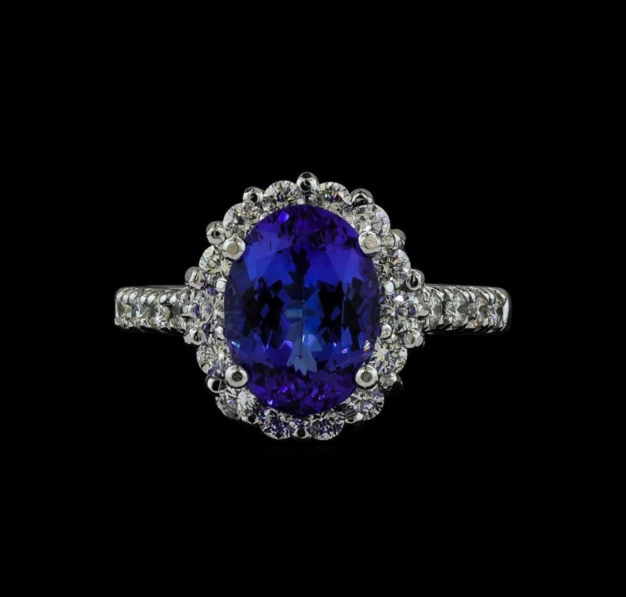One electronically tested 14KT white gold lady's cast fashion ring with a basket halo with a bright polish finish. The featured lady's ring has a shank measuring 2.05 millimeters wide. Identified with markings of '14K'. Condition is new, good workmanship. Containing: One prong set oval modified brilliant cut natural tanzanite, measuring 10.48 x 7.76 x 5.07mm, (depth est.) 5%. bulge factor, approximate weight of 3.01ct., clarity is eye clean, medium dark, moderately strong, violetish blue color, (GIA vB 6/4), cut is very good. Transmitting light with no distortion, transparent. Colored gemstones are presumed to have been subjected to commonly used enhancement processes. Graded in the setting. Eight prong set round brilliant cut diamonds, measuring 1.80 - 1.70 x 1.09mm (depth est.) approximate total weight of 8 Stones = 0.16ct. Graded in the setting. Clarity SI-1 to I-1. Color: H - I Cut Good Fourteen prong set round brilliant cut diamonds, measuring 2.30 - 2.20 x 1.35mm (depth est.) approximate total weight of 14 Stones = 0.58ct. Graded in the setting. Clarity SI-1 to I-1. Color: H - I Cut Good. Total Weight of Colored Stones 3.01ct.. Total Weight of Diamonds 0.74ct.. Total Weight of Ring 5.40gm