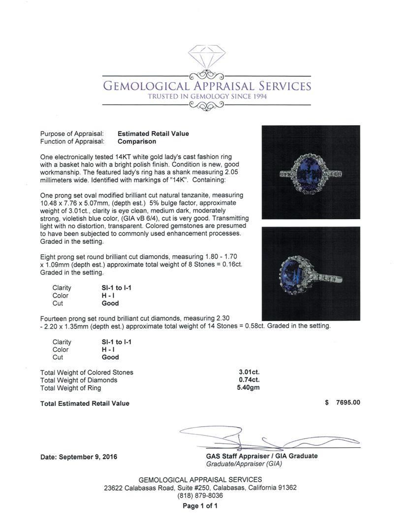 One electronically tested 14KT white gold lady's cast fashion ring with a basket halo with a bright polish finish. The featured lady's ring has a shank measuring 2.05 millimeters wide. Identified with markings of '14K'. Condition is new, good workmanship. Containing: One prong set oval modified brilliant cut natural tanzanite, measuring 10.48 x 7.76 x 5.07mm, (depth est.) 5%. bulge factor, approximate weight of 3.01ct., clarity is eye clean, medium dark, moderately strong, violetish blue color, (GIA vB 6/4), cut is very good. Transmitting light with no distortion, transparent. Colored gemstones are presumed to have been subjected to commonly used enhancement processes. Graded in the setting. Eight prong set round brilliant cut diamonds, measuring 1.80 - 1.70 x 1.09mm (depth est.) approximate total weight of 8 Stones = 0.16ct. Graded in the setting. Clarity SI-1 to I-1. Color: H - I Cut Good Fourteen prong set round brilliant cut diamonds, measuring 2.30 - 2.20 x 1.35mm (depth est.) approximate total weight of 14 Stones = 0.58ct. Graded in the setting. Clarity SI-1 to I-1. Color: H - I Cut Good. Total Weight of Colored Stones 3.01ct.. Total Weight of Diamonds 0.74ct.. Total Weight of Ring 5.40gm
