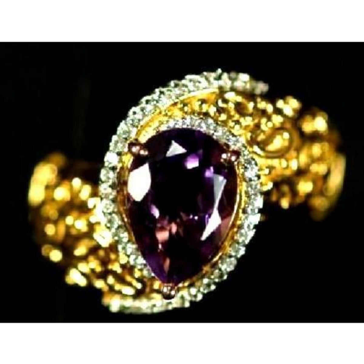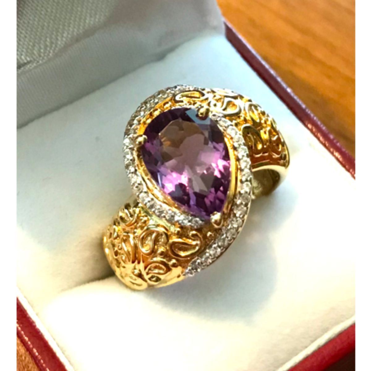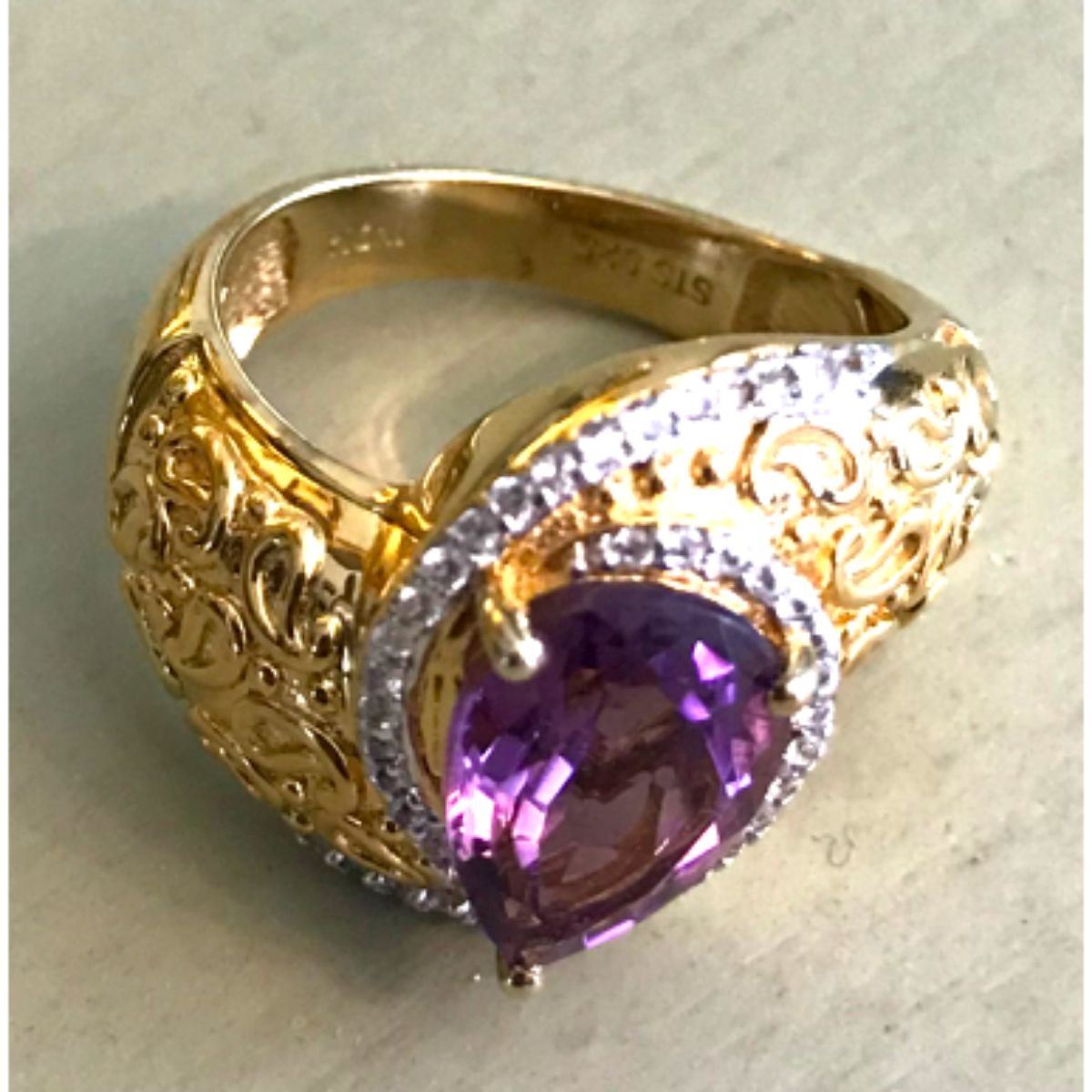 3.01ct pear-shaped Amethyst ( India origin ) set into a gold plate over sterling silver cocktail ring enhanced with clear crystals. Stamped "STS 925, India". Size 8. 10417-050518-LA-00015