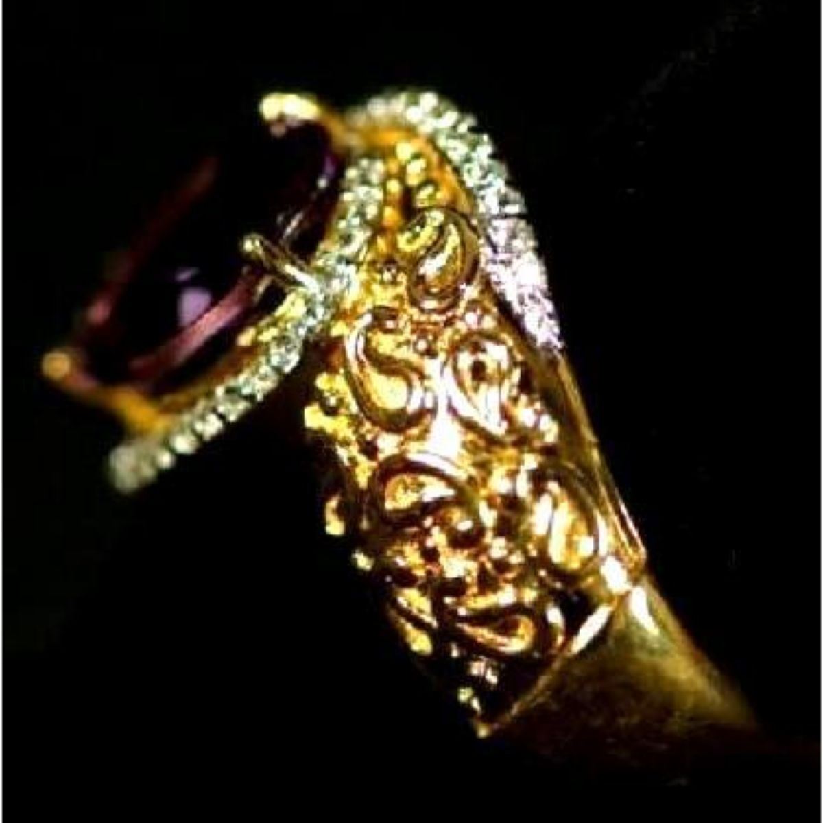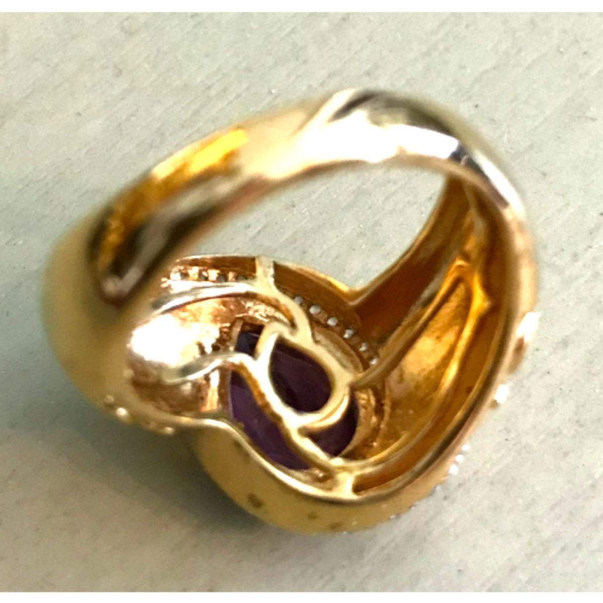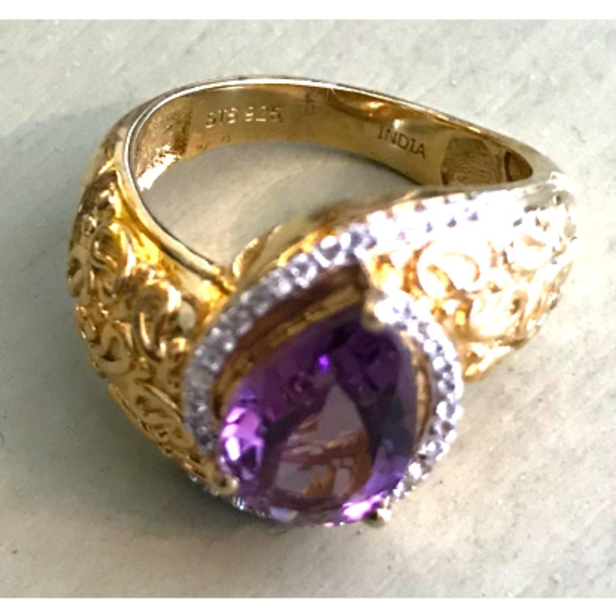 3.01ct pear-shaped Amethyst ( India origin ) set into a gold plate over sterling silver cocktail ring enhanced with clear crystals. Stamped "STS 925, India". Size 8. 10417-050518-LA-00015