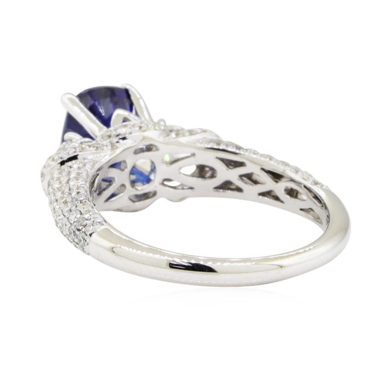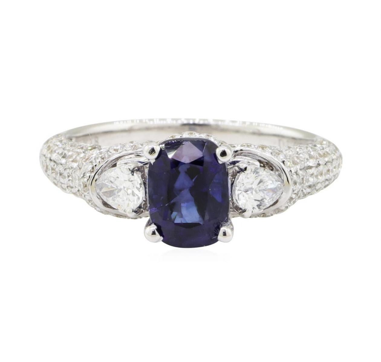 One electronically tested 18KT white gold lady's cast fashion ring with a pave set domed tapered shank with a bright polish finish. The featured lady's ring has a shank measuring 2.00 millimeters wide. Identified with markings of 'K18'. Condition is new, good workmanship. Containing: One prong set rectangular cushion modified brilliant cut natural blue sapphire, measuring 7.54 x 5.65 x 4.95mm, (depth est.) approximate weight of 2.01ct., clarity is slightly included, medium dark, strong, blue color, (GIA B 6/5), cut is very good. Transmitting light with a minimum of distortion, transparent. Naturally occurring internal & external characteristics are present. Colored gemstones are presumed to have been subjected to commonly used enhancement processes. Graded in the setting. Two prong set pear shaped cut diamonds, measuring 4.50 x 3.02 x 1.90mm (depth est.) approximate total weight of 2 Stones = 0.31ct. Graded in the setting. Color G - H Clarity VS-2 to SI-1 Cut Very Good One Hundred Twelve prong set round brilliant cut diamonds, measuring 1.30 - 1.10 x 0.72mm (depth est.) approximate total weight of 112 Stones = 0.70 ct. Graded in the setting. Color G - H Clarity VS-2 to SI-1 Cut Very Good. Total Weight of Colored Stones 2.01ct.. Total Weight of Diamonds 1.01ct.. Total Weight of Ring 4.60gm GAS Appraised at $7945.00. GAS Appraised.