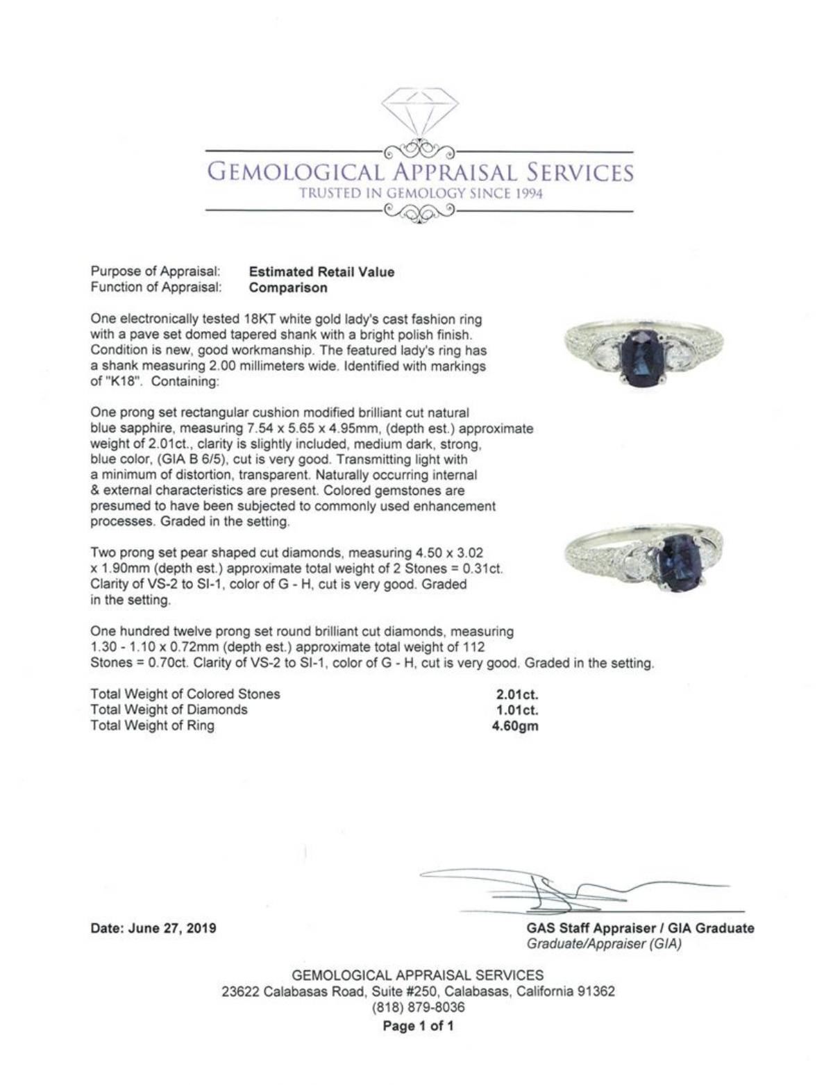 One electronically tested 18KT white gold lady's cast fashion ring with a pave set domed tapered shank with a bright polish finish. The featured lady's ring has a shank measuring 2.00 millimeters wide. Identified with markings of 'K18'. Condition is new, good workmanship. Containing: One prong set rectangular cushion modified brilliant cut natural blue sapphire, measuring 7.54 x 5.65 x 4.95mm, (depth est.) approximate weight of 2.01ct., clarity is slightly included, medium dark, strong, blue color, (GIA B 6/5), cut is very good. Transmitting light with a minimum of distortion, transparent. Naturally occurring internal & external characteristics are present. Colored gemstones are presumed to have been subjected to commonly used enhancement processes. Graded in the setting. Two prong set pear shaped cut diamonds, measuring 4.50 x 3.02 x 1.90mm (depth est.) approximate total weight of 2 Stones = 0.31ct. Graded in the setting. Color G - H Clarity VS-2 to SI-1 Cut Very Good One Hundred Twelve prong set round brilliant cut diamonds, measuring 1.30 - 1.10 x 0.72mm (depth est.) approximate total weight of 112 Stones = 0.70 ct. Graded in the setting. Color G - H Clarity VS-2 to SI-1 Cut Very Good. Total Weight of Colored Stones 2.01ct.. Total Weight of Diamonds 1.01ct.. Total Weight of Ring 4.60gm GAS Appraised at $7945.00. GAS Appraised.