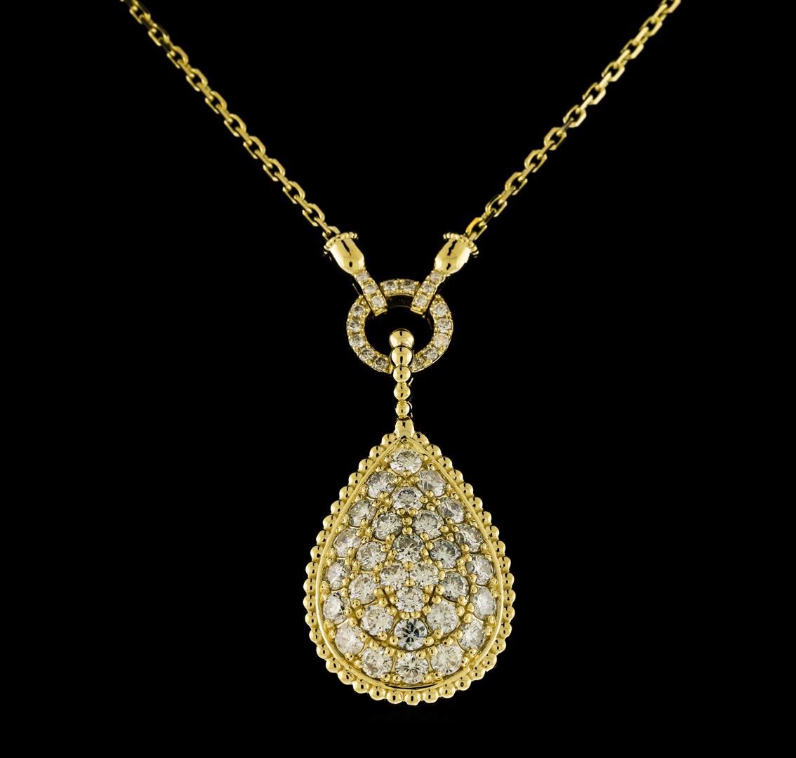 One electronically tested 14KT yellow gold lady's combination cast & assembled fashion necklace with a lobster claw clasp with a bright polish finish. The featured lady's necklace has a 16 inch long 1.5mm diamond cut cable link chain with a drop of 41 millimeters. Identified with markings of 'K14'. Condition is new, good workmanship. Containing: Thirty prong set round brilliant cut diamonds, measuring 3.00 - 2.90 x 1.77mm (depth est.) approximate total weight of 30 Stones = 2.80ct. Graded in the setting. Clarity SI-1 to I-1. Color: G - I Cut Good Eighteen prong set round brilliant cut diamonds, measuring 1.50 - 1.45 x 0.92mm (depth est.) approximate total weight of 18 Stones = 0.22ct. Graded in the setting. Clarity SI-1 to SI-2. Color: H - I Cut Good. Total Weight of Diamonds 3.02ct.. Total Weight of Necklace 12.10gm. GAS Appraised at $8,225.00.