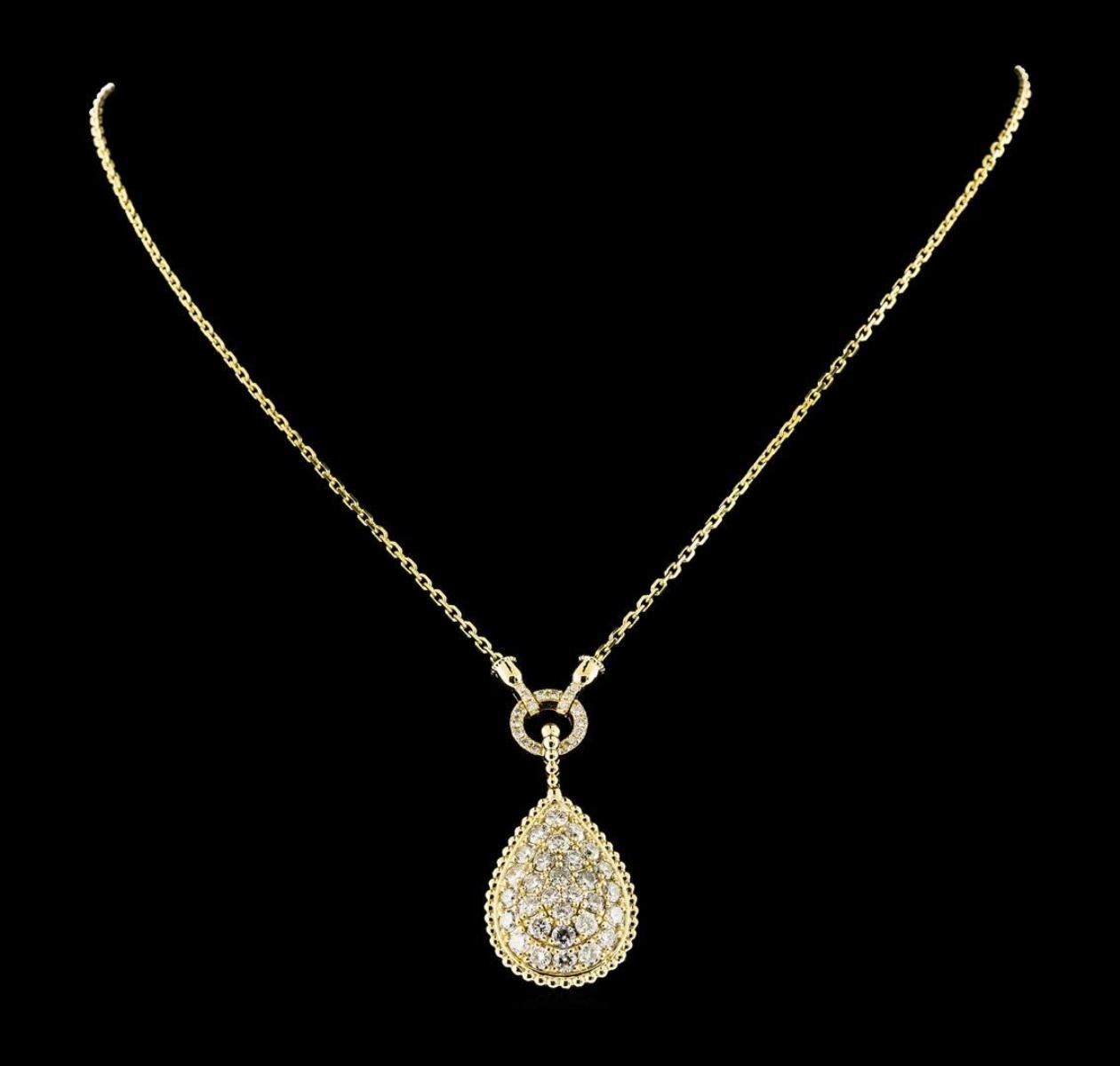 One electronically tested 14KT yellow gold lady's combination cast & assembled fashion necklace with a lobster claw clasp with a bright polish finish. The featured lady's necklace has a 16 inch long 1.5mm diamond cut cable link chain with a drop of 41 millimeters. Identified with markings of 'K14'. Condition is new, good workmanship. Containing: Thirty prong set round brilliant cut diamonds, measuring 3.00 - 2.90 x 1.77mm (depth est.) approximate total weight of 30 Stones = 2.80ct. Graded in the setting. Clarity SI-1 to I-1. Color: G - I Cut Good Eighteen prong set round brilliant cut diamonds, measuring 1.50 - 1.45 x 0.92mm (depth est.) approximate total weight of 18 Stones = 0.22ct. Graded in the setting. Clarity SI-1 to SI-2. Color: H - I Cut Good. Total Weight of Diamonds 3.02ct.. Total Weight of Necklace 12.10gm. GAS Appraised.