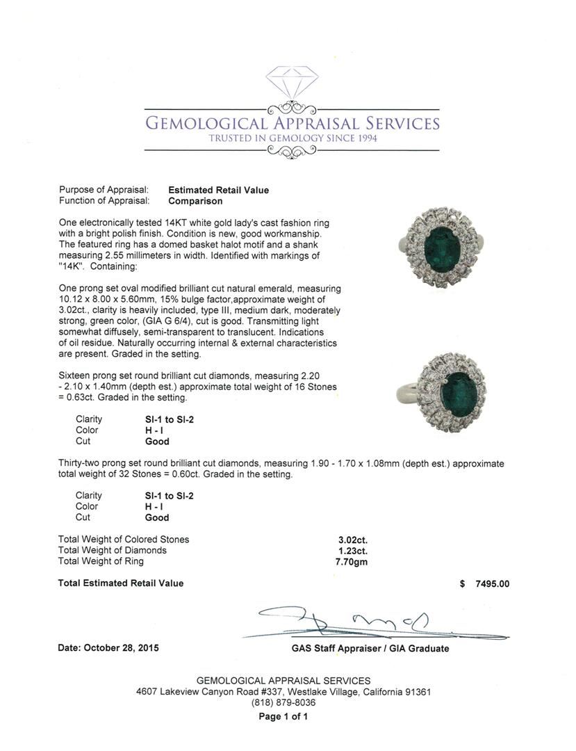 One electronically tested 14KT white gold lady's cast fashion ring with a bright polish finish. The featured ring has a domed basket halo motif and a shank measuring 2.55 millimeters in width. Identified with markings of "14K". Condition is new, good workmanship. Containing: One prong set oval modified brilliant cut natural emerald, measuring 10.12 x 8.00 x 5.60mm, 15% bulge factor, approximate weight of 3.02ct., clarity is heavily included, type III, medium dark, moderately strong, green color, (GIA G 6/4), cut is good. Transmitting light somewhat diffusely, semi-transparent to translucent. Indications of oil residue. Naturally occurring internal & external characteristics are present. Graded in the setting. Sixteen prong set round brilliant cut diamonds, measuring 2.20 - 2.10 x 1.40mm (depth est.) approximate total weight of 16 Stones = 0.63ct. Graded in the setting. Clarity: SI-1 to SI-2. Color: H - I. Cut Good Thirty-Two prong set round brilliant cut diamonds, measuring 1.90 - 1.70 x 1.08mm (depth est.) approximate total weight of 32 Stones = 0.60ct. Graded in the setting. Clarity: SI-1 to SI-2. Color: H - I. Cut Good. Total Weight of Colored Stones 3.02ct. Total Weight of Diamonds 1.23ct. Total Weight of Ring 7.70gm. GAS Appraised at $7,495.00.