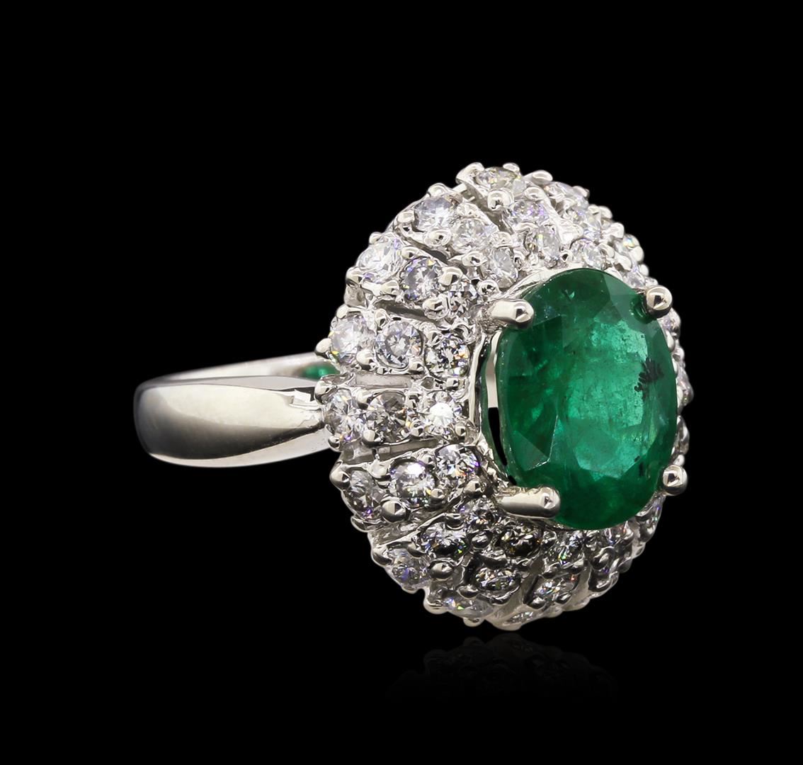 One electronically tested 14KT white gold lady's cast fashion ring with a bright polish finish. The featured ring has a domed basket halo motif and a shank measuring 2.55 millimeters in width. Identified with markings of "14K". Condition is new, good workmanship. Containing: One prong set oval modified brilliant cut natural emerald, measuring 10.12 x 8.00 x 5.60mm, 15% bulge factor, approximate weight of 3.02ct., clarity is heavily included, type III, medium dark, moderately strong, green color, (GIA G 6/4), cut is good. Transmitting light somewhat diffusely, semi-transparent to translucent. Indications of oil residue. Naturally occurring internal & external characteristics are present. Graded in the setting. Sixteen prong set round brilliant cut diamonds, measuring 2.20 - 2.10 x 1.40mm (depth est.) approximate total weight of 16 Stones = 0.63ct. Graded in the setting. Clarity: SI-1 to SI-2. Color: H - I. Cut Good Thirty-Two prong set round brilliant cut diamonds, measuring 1.90 - 1.70 x 1.08mm (depth est.) approximate total weight of 32 Stones = 0.60ct. Graded in the setting. Clarity: SI-1 to SI-2. Color: H - I. Cut Good. Total Weight of Colored Stones 3.02ct. Total Weight of Diamonds 1.23ct. Total Weight of Ring 7.70gm. GAS Appraised at $7,495.00.