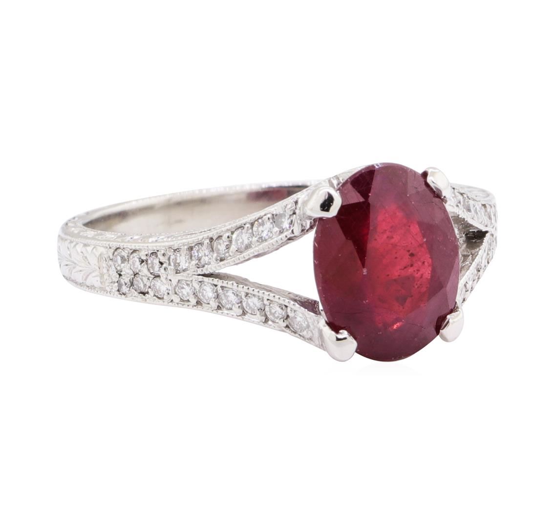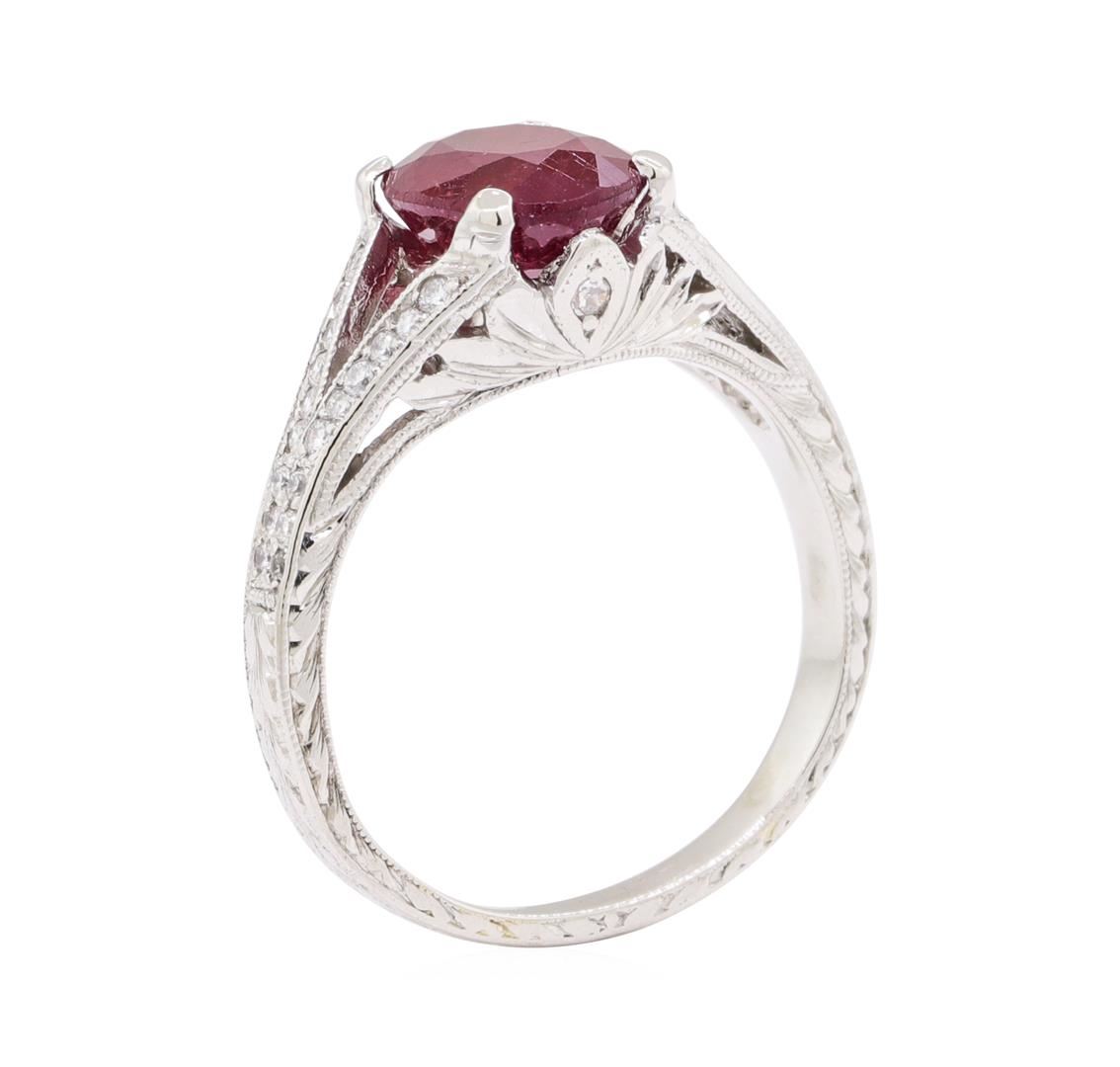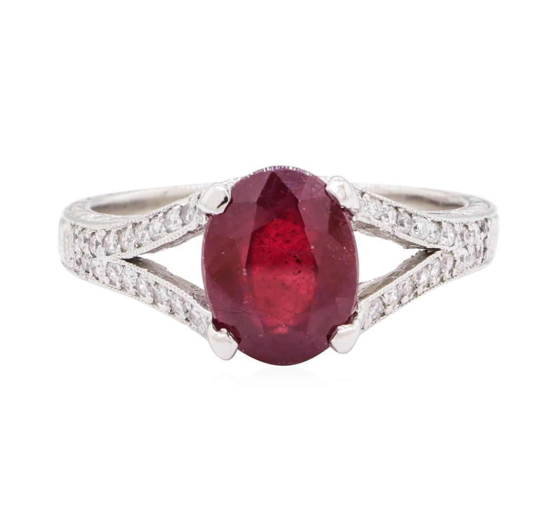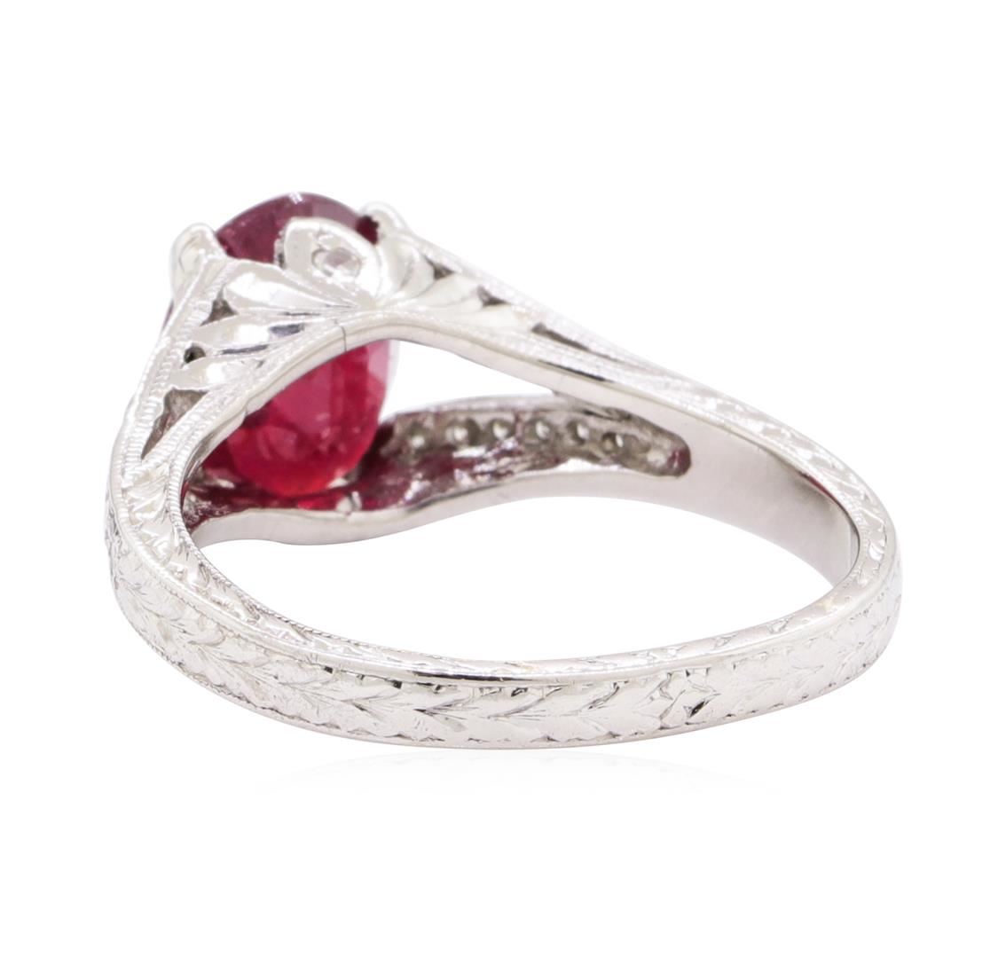 One electronically tested platinum lady's cast fashion ring with a split cathedral shank with a hand engraving and milgrain detail finish. The featured lady's ring has a shank measuring 2.30 millimeters wide. Identified with markings of 'PLAT'. Condition is like new, good workmanship. Containing: One prong set oval modified mixed cut natural ruby-glass composite, measuring 9.17 x 7.14 x 4.60mm, (depth est.) 5%. bulge factor, approximate weight of 2.73ct., clarity is heavily included, medium dark, moderately strong, red color, (GIA R 6/4), cut is good. Transmitting light somewhat diffusely, semi-transparent to translucent. Naturally occurring internal & external characteristics are present. Indications of laboratory high temperature heat treatment, with glass & flux additives. Colored gemstones are presumed to have been subjected to commonly used enhancement processes. Graded in the setting. Thirty-Six prong set round brilliant cut diamonds, measuring 1.30 - 1.20 x 0.78mm (depth est.) approximate total weight of 36 Stones = 0.27ct. Graded in the setting. Color G - H Clarity VS-2 to SI-1 Cut Good One prong set round brilliant cut diamond, measuring 1.50 - 1.45 x 0.92mm (depth est.) approximate weight of 0.01ct. Graded in the setting. Color G Clarity SI-1 Cut Very Good One prong set single cut diamond, measuring 1.50 - 1.45 x 0.92mm (depth est.) approximate weight of 0.01ct. Color I Clarity I-1 Cut Good. Total Weight of Colored Stones 2.73ct.. Total Weight of Diamonds 0.29ct.. Total Weight of Ring 6.30gm GAS Appraised at $2035.00. GAS Appraised at $2,035.00.